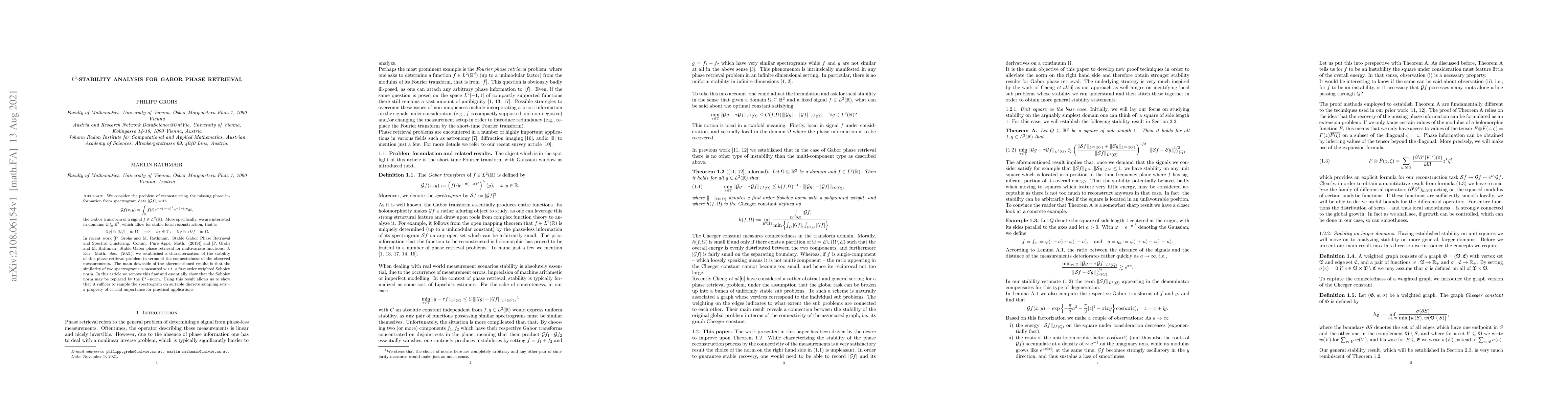 This paper addresses the problem of reconstructing missing phase information from spectrogram data using Gabor transforms, focusing on domains that allow for stable local reconstruction. The authors improve upon previous work by replacing the first-order weighted Sobolev norm with the $L^2$-norm, demonstrating that suitable discrete sampling sets are sufficient for practical applications.
