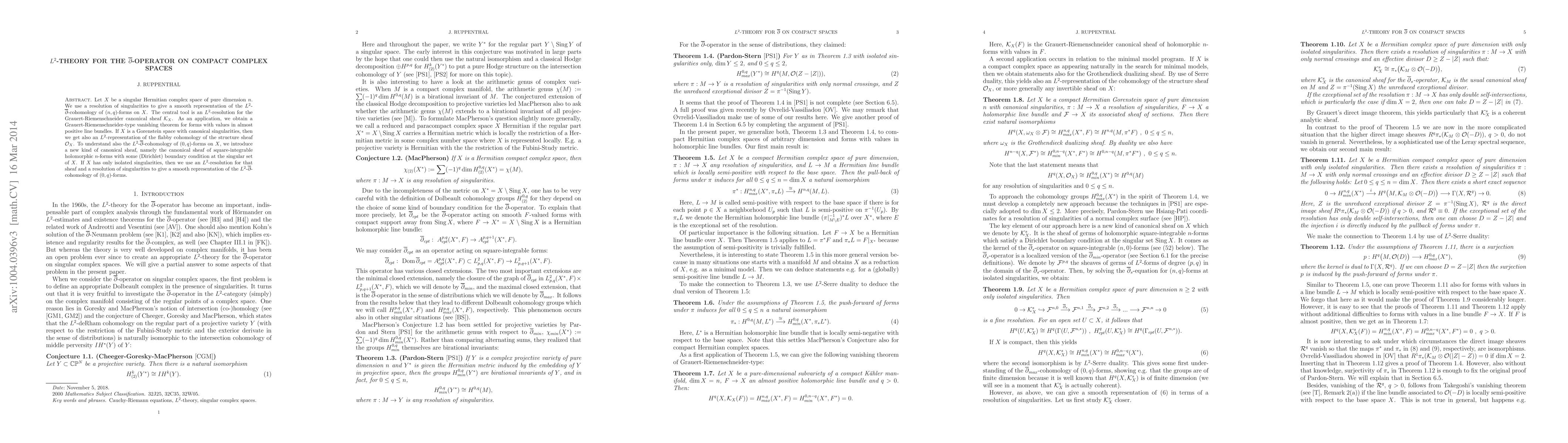 This paper develops an $L^2$-theory for the $\overline\partial$-operator on singular Hermitian complex spaces, providing smooth representations of $L^2$-cohomology for $(n,q)$-forms using a resolution of singularities and an $L^2$-resolution for the Grauert-Riemenschneider canonical sheaf. It also establishes a Grauert-Riemenschneider-type vanishing theorem for forms with values in almost positive line bundles.