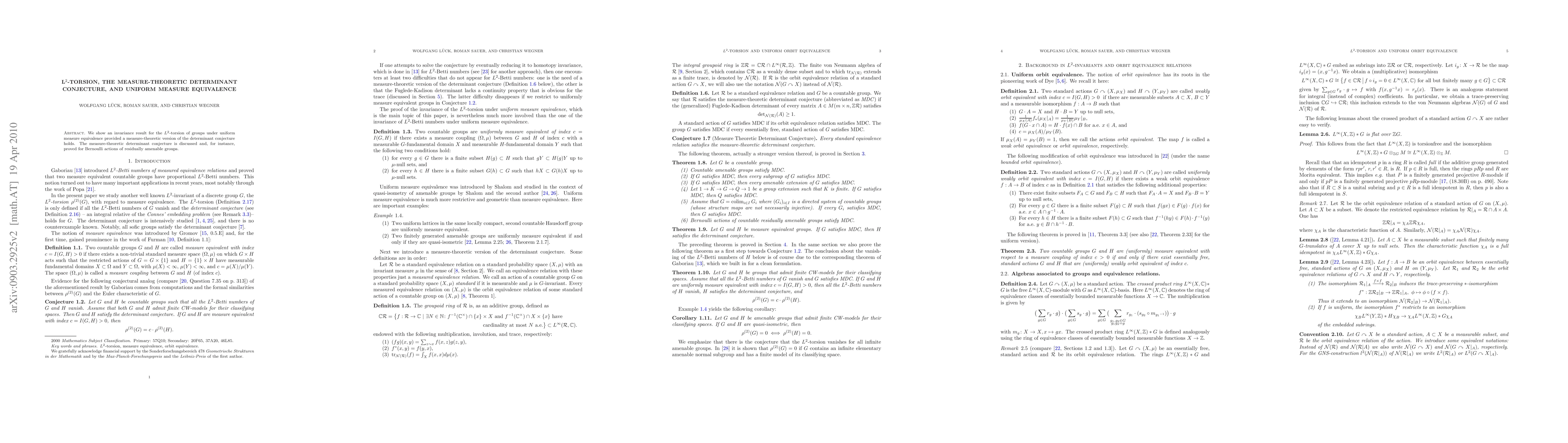 Summary: This paper demonstrates an invariance result for L2-torsion under uniform measure equivalence, contingent on the validity of a measure-theoretic determinant conjecture, which is proven for Bernoulli actions of residually amenable groups.