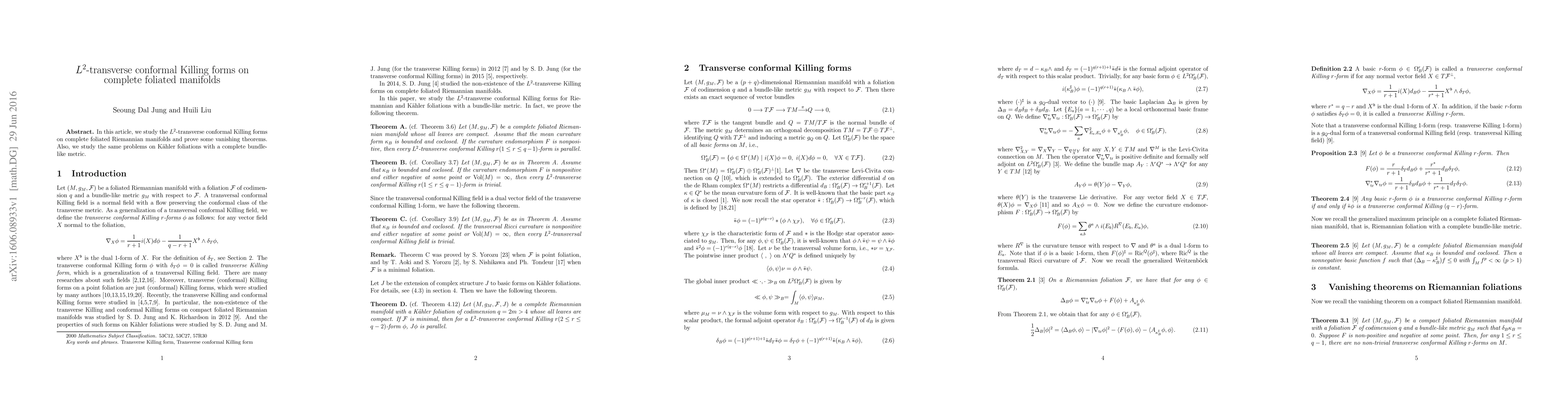 This paper investigates L2-transverse conformal Killing forms on complete foliated Riemannian manifolds, establishing vanishing theorems, and extends similar studies to Kähler foliations with a complete bundle-like metric.