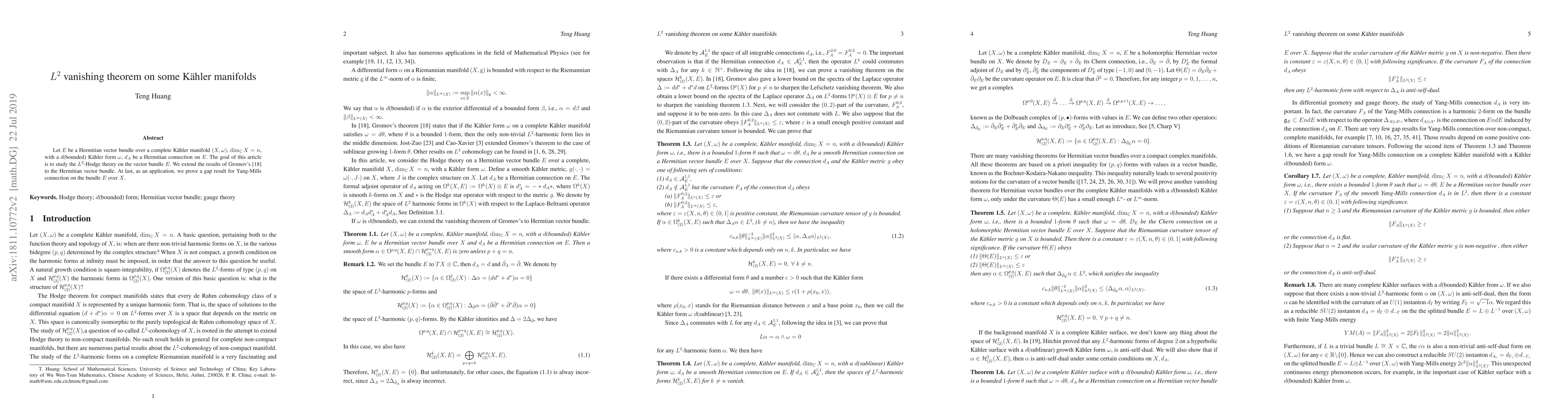 This paper extends Gromov's $L^{2}$ vanishing theorem to Hermitian vector bundles over complete Kähler manifolds, applying $L^{2}$-Hodge theory and proving a gap result for Yang-Mills connections on the vector bundle.