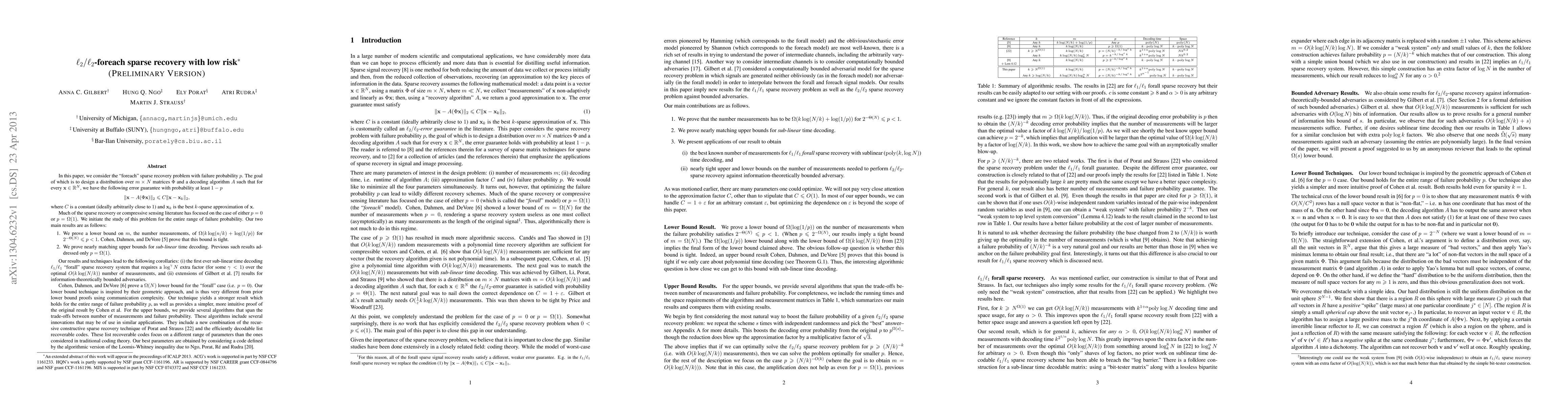 In this paper, we consider the "foreach" sparse recovery problem with failure probability $p$. The goal of which is to design a distribution over $m \times N$ matrices $\Phi$ and a decoding algorithm $\algo$ such that for every $\vx\in\R^N$, we have the following error guarantee with probability at least $1-p$ \[\|\vx-\algo(\Phi\vx)\|_2\le C\|\vx-\vx_k\|_2,\] where $C$ is a constant (ideally arbitrarily close to 1) and $\vx_k$ is the best $k$-sparse approximation of $\vx$. Much of the sparse recovery or compressive sensing literature has focused on the case of either $p = 0$ or $p = \Omega(1)$. We initiate the study of this problem for the entire range of failure probability. Our two main results are as follows: \begin{enumerate} \item We prove a lower bound on $m$, the number measurements, of $\Omega(k\log(n/k)+\log(1/p))$ for $2^{-\Theta(N)}\le p <1$. Cohen, Dahmen, and DeVore \cite{CDD2007:NearOptimall2l2} prove that this bound is tight. \item We prove nearly matching upper bounds for \textit{sub-linear} time decoding. Previous such results addressed only $p = \Omega(1)$. \end{enumerate} Our results and techniques lead to the following corollaries: (i) the first ever sub-linear time decoding $\lolo$ "forall" sparse recovery system that requires a $\log^{\gamma}{N}$ extra factor (for some $\gamma<1$) over the optimal $O(k\log(N/k))$ number of measurements, and (ii) extensions of Gilbert et al. \cite{GHRSW12:SimpleSignals} results for information-theoretically bounded adversaries.