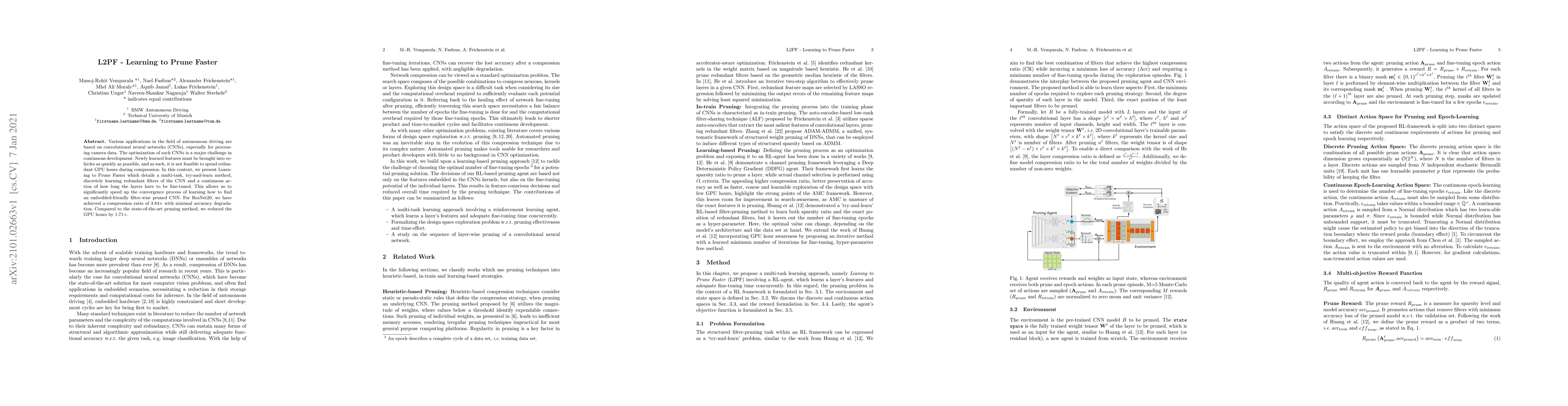 Various applications in the field of autonomous driving are based on convolutional neural networks (CNNs), especially for processing camera data. The optimization of such CNNs is a major challenge in continuous development. Newly learned features must be brought into vehicles as quickly as possible, and as such, it is not feasible to spend redundant GPU hours during compression. In this context, we present Learning to Prune Faster which details a multi-task, try-and-learn method, discretely learning redundant filters of the CNN and a continuous action of how long the layers have to be fine-tuned. This allows us to significantly speed up the convergence process of learning how to find an embedded-friendly filter-wise pruned CNN. For ResNet20, we have achieved a compression ratio of 3.84 x with minimal accuracy degradation. Compared to the state-of-the-art pruning method, we reduced the GPU hours by 1.71 x.