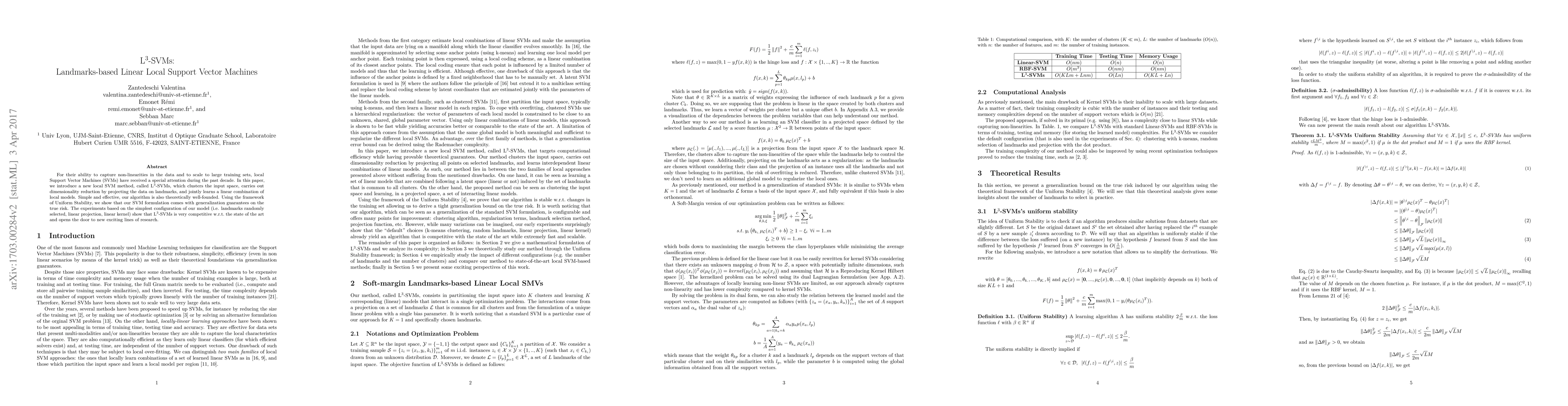For their ability to capture non-linearities in the data and to scale to large training sets, local Support Vector Machines (SVMs) have received a special attention during the past decade. In this paper, we introduce a new local SVM method, called L$^3$-SVMs, which clusters the input space, carries out dimensionality reduction by projecting the data on landmarks, and jointly learns a linear combination of local models. Simple and effective, our algorithm is also theoretically well-founded. Using the framework of Uniform Stability, we show that our SVM formulation comes with generalization guarantees on the true risk. The experiments based on the simplest configuration of our model (i.e. landmarks randomly selected, linear projection, linear kernel) show that L$^3$-SVMs is very competitive w.r.t. the state of the art and opens the door to new exciting lines of research.