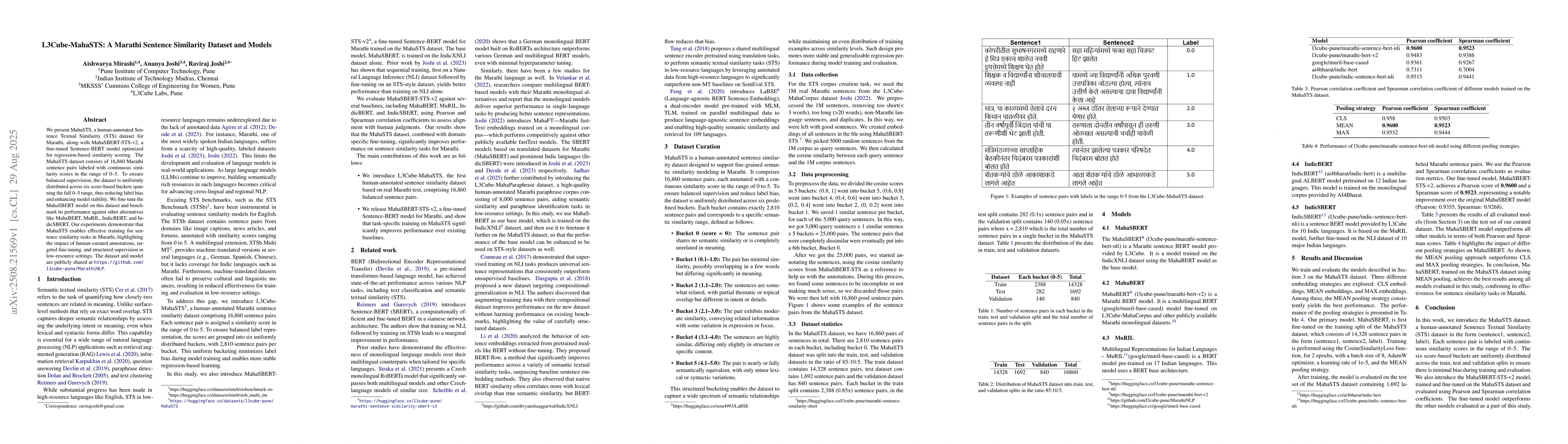 We present MahaSTS, a human-annotated Sentence Textual Similarity (STS) dataset for Marathi, along with MahaSBERT-STS-v2, a fine-tuned Sentence-BERT model optimized for regression-based similarity scoring. The MahaSTS dataset consists of 16,860 Marathi sentence pairs labeled with continuous similarity scores in the range of 0-5. To ensure balanced supervision, the dataset is uniformly distributed across six score-based buckets spanning the full 0-5 range, thus reducing label bias and enhancing model stability. We fine-tune the MahaSBERT model on this dataset and benchmark its performance against other alternatives like MahaBERT, MuRIL, IndicBERT, and IndicSBERT. Our experiments demonstrate that MahaSTS enables effective training for sentence similarity tasks in Marathi, highlighting the impact of human-curated annotations, targeted fine-tuning, and structured supervision in low-resource settings. The dataset and model are publicly shared at https://github.com/l3cube-pune/MarathiNLP