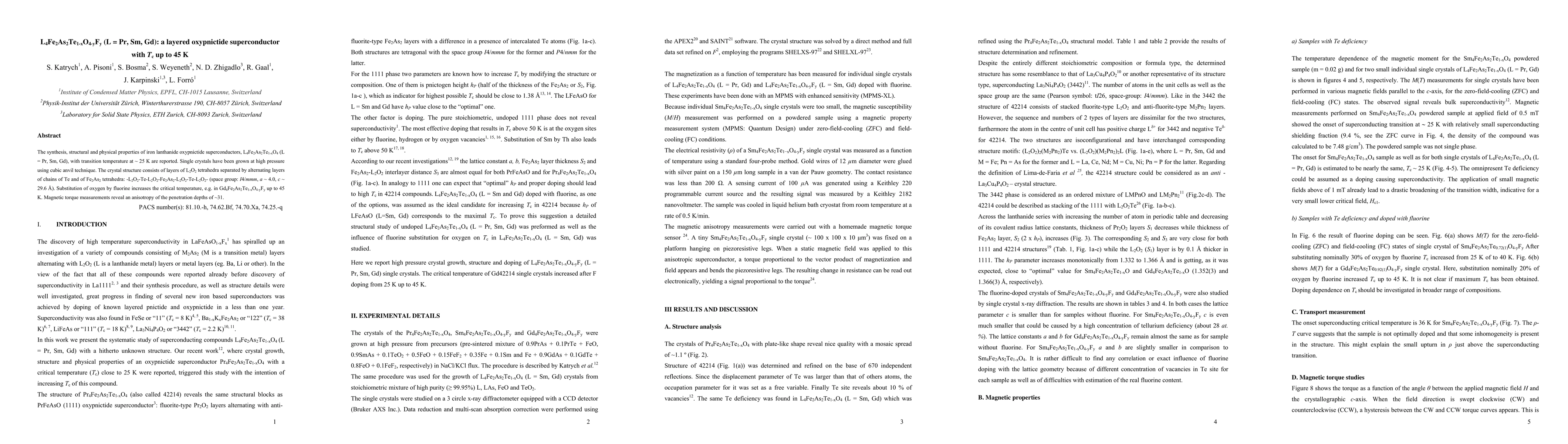 The synthesis, structural and physical properties of iron lanthanide oxypnictide superconductors, L4Fe2As2Te1-xO4 (L = Pr, Sm, Gd), with transition temperature at ~ 25 K are reported. Single crystals have been grown at high pressure using cubic anvil technique. The crystal structure consists of layers of L2O2 tetrahedra separated by alternating layers of chains of Te and of Fe2As2 tetrahedra: -L2O2-Te-L2O2-Fe2As2-L2O2-Te-L2O2- (space group: I4/mmm, a ~ 4.0, c ~ 29.6 {\AA}). Substitution of oxygen by fluorine increases the critical temperature, e.g. in Gd4Fe2As2Te1-xOyF4-y up to 45 K. Magnetic torque measurements reveal an anisotropy of the penetration depths of ~31.