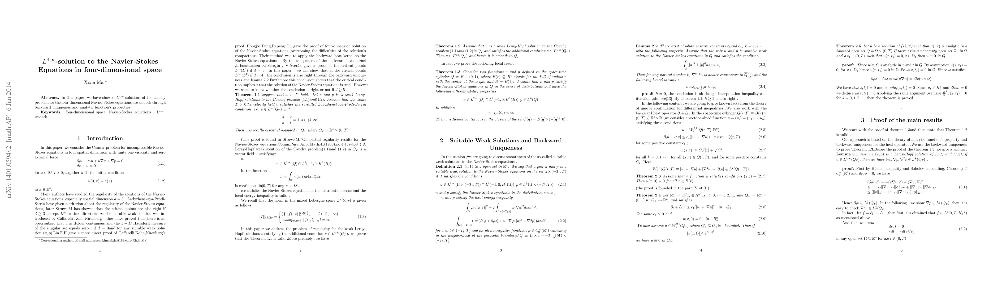 In this paper, we have showed $L^{4,\infty}$-solutions to the cauchy problem for the four-dimensional Navier-Stokes equations are smooth through backward uniqueness and analytic functions properties .