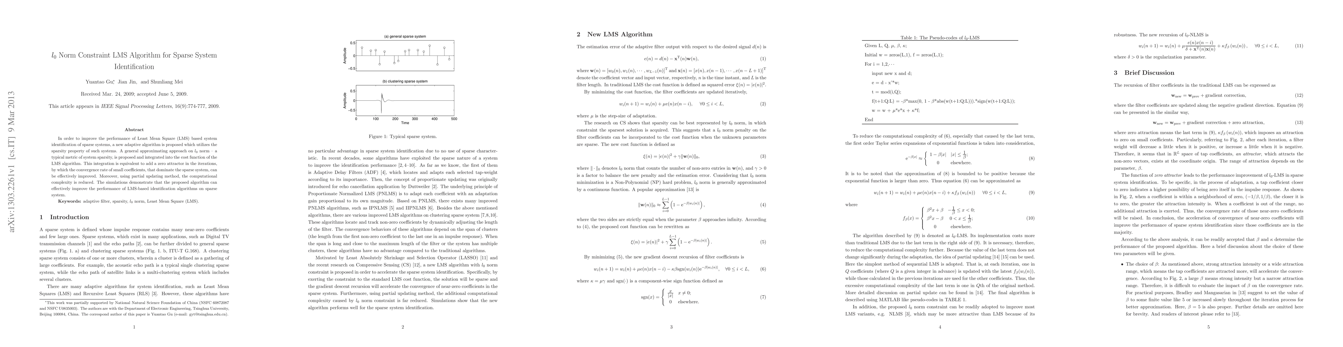 The paper proposes a new adaptive LMS algorithm incorporating an $l_0$ norm constraint to enhance sparse system identification. This method improves convergence rates for small coefficients and reduces computational complexity through a partial updating approach, demonstrating superior performance in simulations.