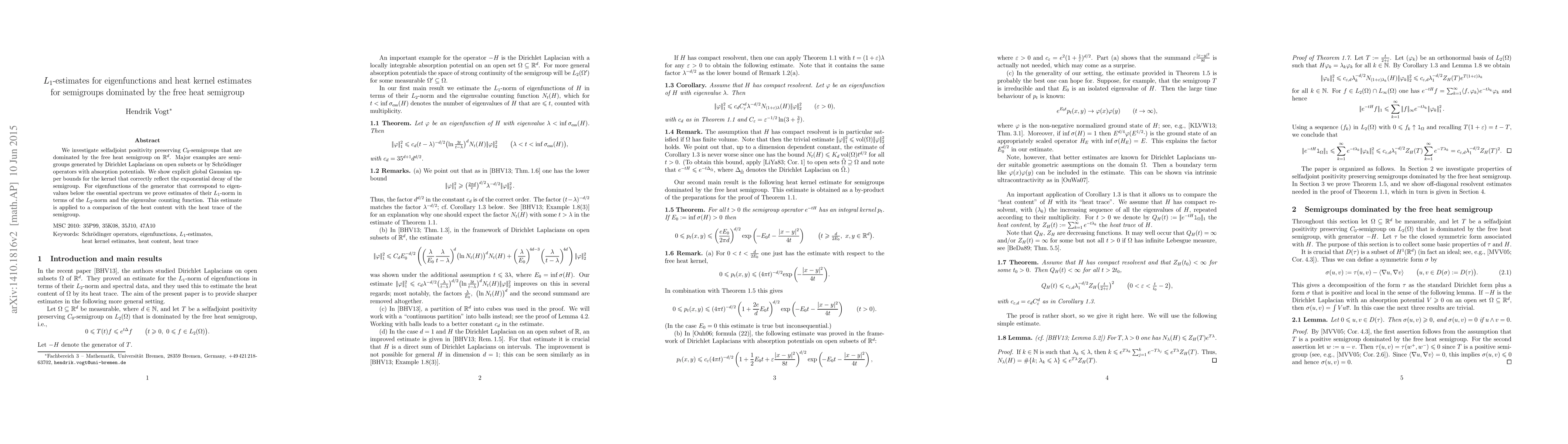 This paper investigates selfadjoint $C_0$-semigroups dominated by the free heat semigroup, proving explicit Gaussian upper bounds for their kernels. It also establishes $L_1$-norm estimates for eigenfunctions corresponding to eigenvalues below the essential spectrum, relating them to $L_2$-norms and the eigenvalue counting function.