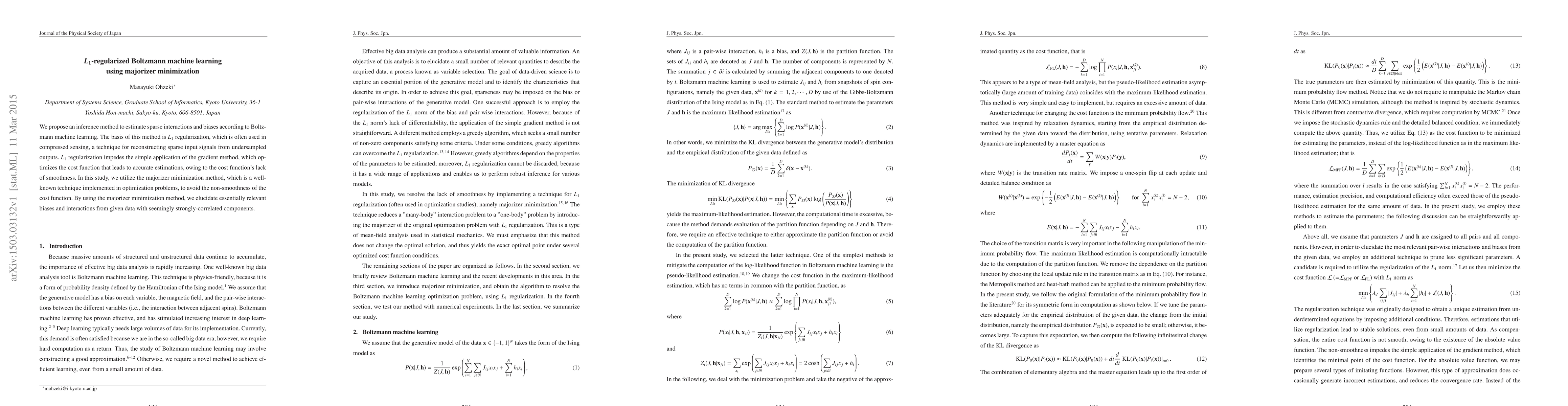 This paper proposes an $L_1$-regularized inference method for Boltzmann machine learning that estimates sparse interactions and biases. It uses majorizer minimization to address the non-smoothness of the cost function, enabling the identification of essential biases and interactions from data with strongly correlated components.