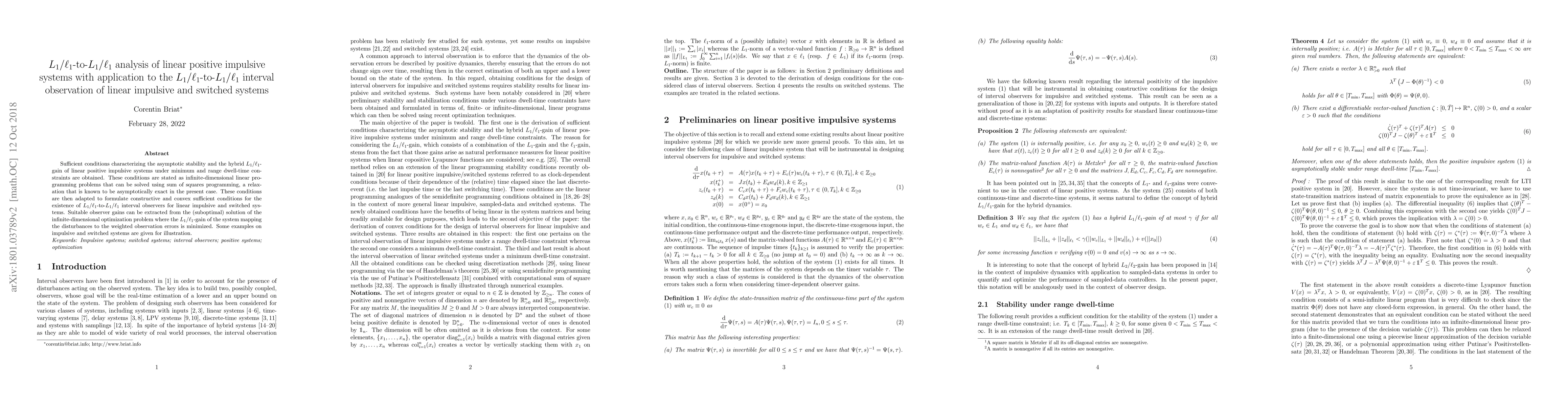 Sufficient conditions characterizing the asymptotic stability and the hybrid $L_1/\ell_1$-gain of linear positive impulsive systems under minimum and range dwell-time constraints are obtained. These conditions are stated as infinite-dimensional linear programming problems that can be solved using sum of squares programming, a relaxation that is known to be asymptotically exact in the present case. These conditions are then adapted to formulate constructive and convex sufficient conditions for the existence of $L_1/\ell_1$-to-$L_1/\ell_1$ interval observers for linear impulsive and switched systems. Suitable observer gains can be extracted from the (suboptimal) solution of the infinite-dimensional optimization problem where the $L_1/\ell_1$-gain of the system mapping the disturbances to the weighted observation errors is minimized. Some examples on impulsive and switched systems are given for illustration.
