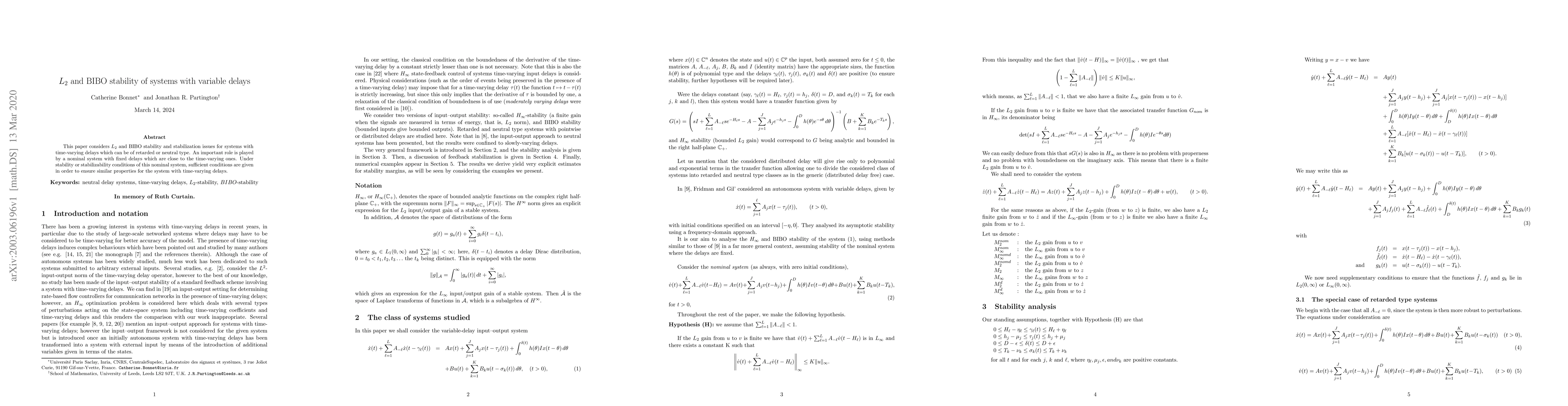 This paper explores $L_2$ and BIBO stability for systems with variable delays, providing sufficient conditions based on a nominal system with fixed delays to ensure similar properties.