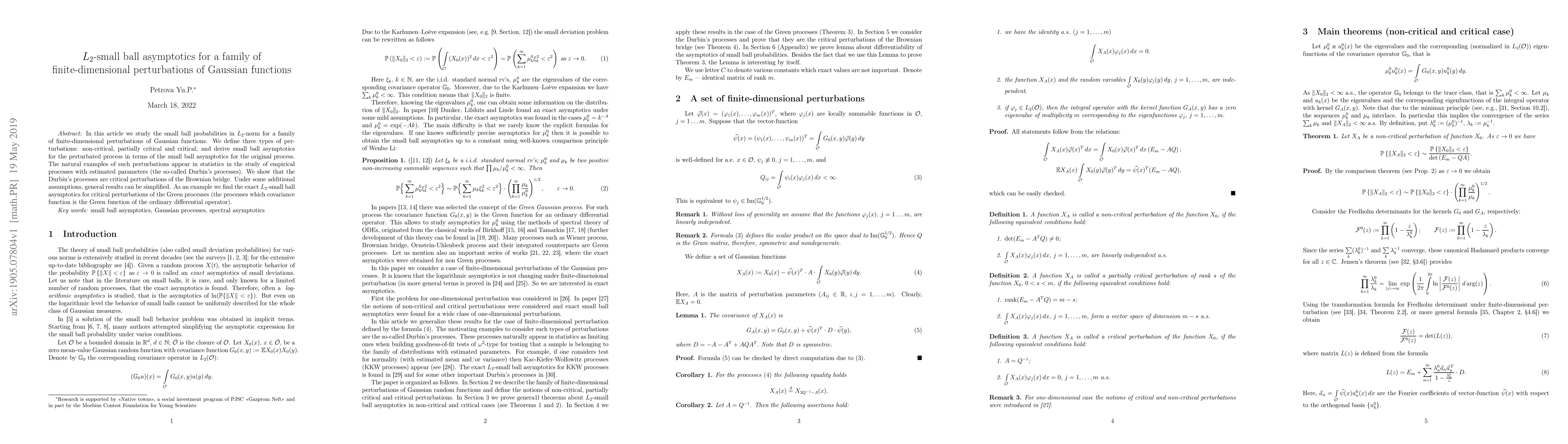 This paper investigates small ball probabilities in $L_2$-norm for finite-dimensional perturbations of Gaussian functions, classifying them into non-critical, partially critical, and critical types. It derives asymptotic results for these perturbations and applies them to Durbin's processes, showing they are critical perturbations of the Brownian bridge.