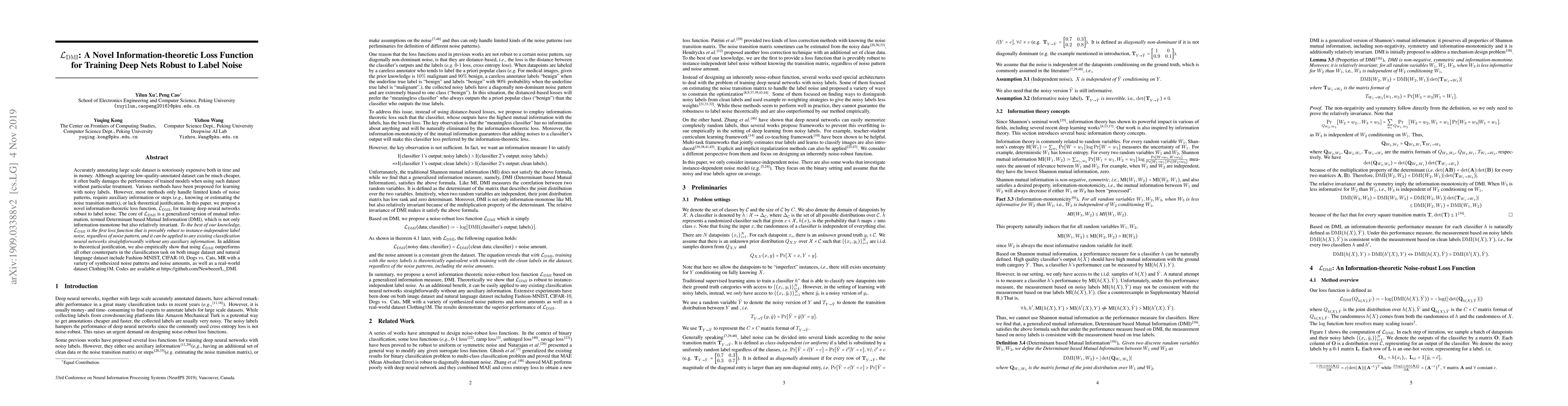 Accurately annotating large scale dataset is notoriously expensive both in time and in money. Although acquiring low-quality-annotated dataset can be much cheaper, it often badly damages the performance of trained models when using such dataset without particular treatment. Various methods have been proposed for learning with noisy labels. However, most methods only handle limited kinds of noise patterns, require auxiliary information or steps (e.g. , knowing or estimating the noise transition matrix), or lack theoretical justification. In this paper, we propose a novel information-theoretic loss function, $\mathcal{L}_{DMI}$, for training deep neural networks robust to label noise. The core of $\mathcal{L}_{DMI}$ is a generalized version of mutual information, termed Determinant based Mutual Information (DMI), which is not only information-monotone but also relatively invariant. \emph{To the best of our knowledge, $\mathcal{L}_{DMI}$ is the first loss function that is provably robust to instance-independent label noise, regardless of noise pattern, and it can be applied to any existing classification neural networks straightforwardly without any auxiliary information}. In addition to theoretical justification, we also empirically show that using $\mathcal{L}_{DMI}$ outperforms all other counterparts in the classification task on both image dataset and natural language dataset include Fashion-MNIST, CIFAR-10, Dogs vs. Cats, MR with a variety of synthesized noise patterns and noise amounts, as well as a real-world dataset Clothing1M. Codes are available at https://github.com/Newbeeer/L_DMI .