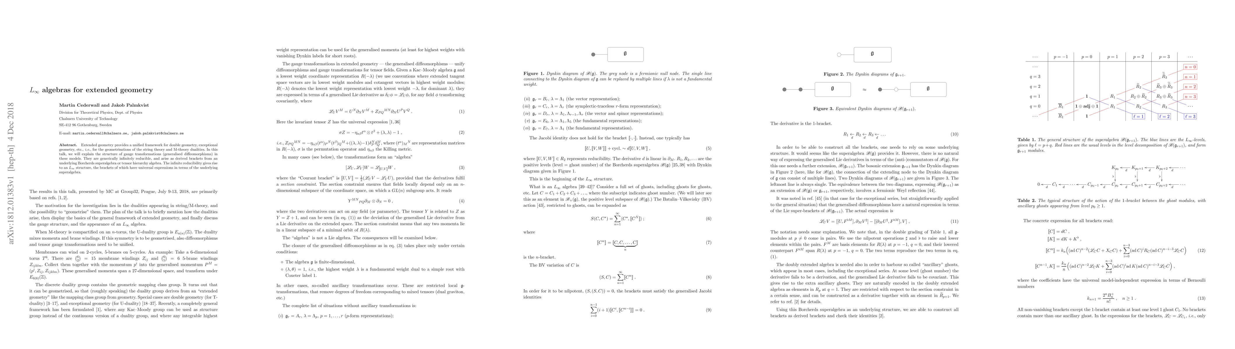 Extended geometry provides a unified framework for double geometry, exceptional geometry, etc., i.e., for the geometrisations of the string theory and M-theory dualities. In this talk, we will explain the structure of gauge transformations (generalised diffeomorphisms) in these models. They are generically infinitely reducible, and arise as derived brackets from an underlying Borcherds superalgebra or tensor hierarchy algebra. The infinite reducibility gives rise to an $L_\infty$ structure, the brackets of which have universal expressions in terms of the underlying superalgebra.