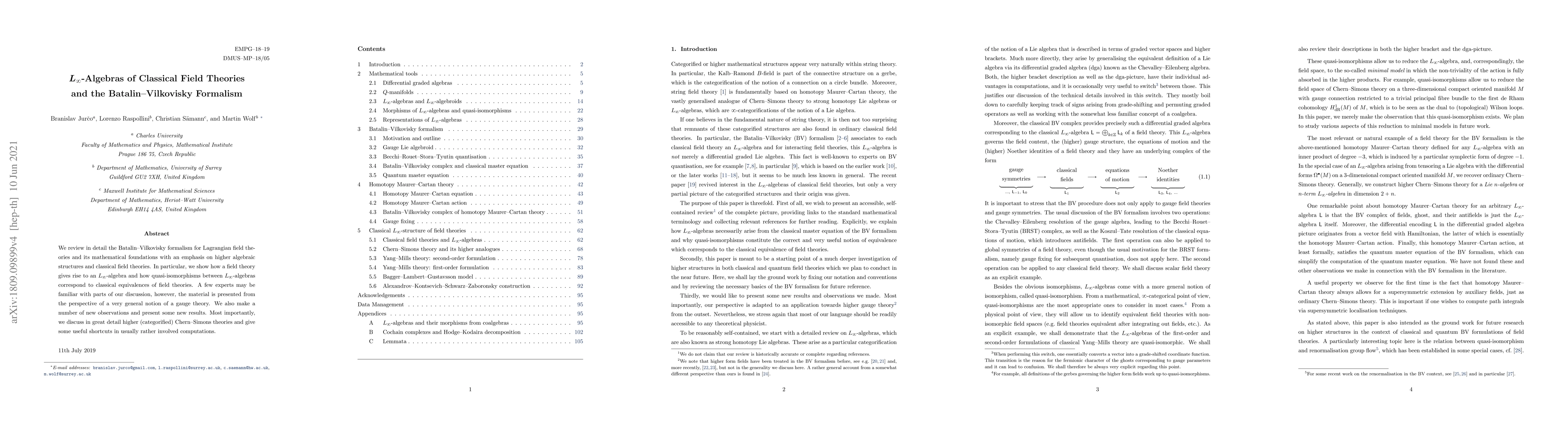 This paper reviews the Batalin-Vilkovisky formalism and its mathematical foundations, focusing on $L_\infty$-algebras in classical field theories. The authors demonstrate how field theories generate $L_\infty$-algebras and discuss quasi-isomorphisms as classical equivalences, with new insights into higher Chern-Simons theories and simplified computational methods.
