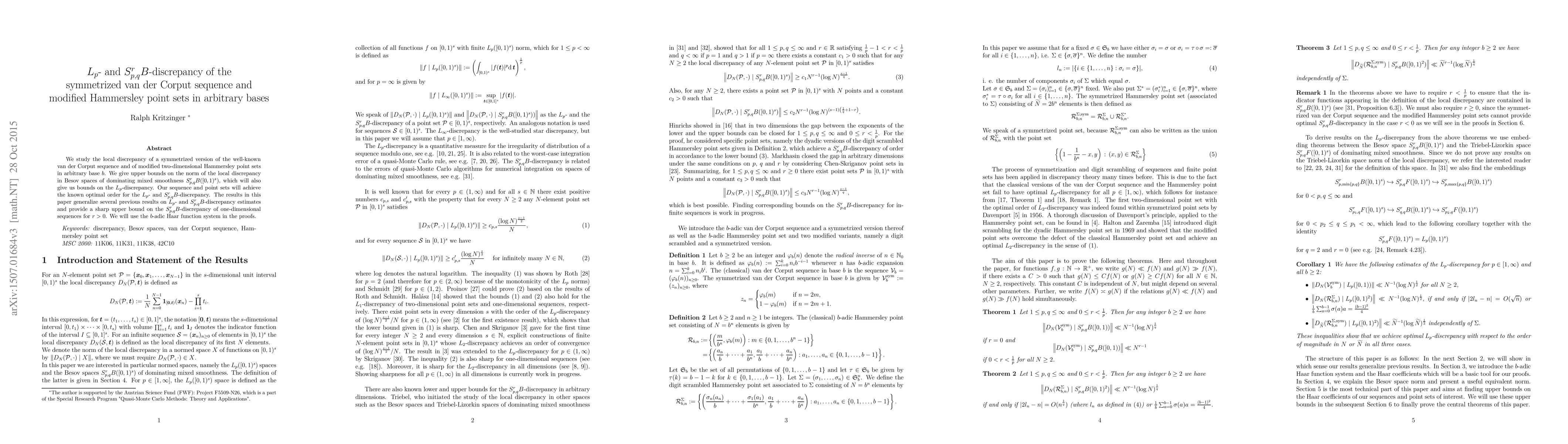 This paper investigates the local discrepancy of symmetrized van der Corput sequences and modified Hammersley point sets in arbitrary bases, providing upper bounds on their $L_p$- and $S_{p,q}^rB$-discrepancy. The results achieve optimal order and generalize previous estimates, using the $b$-adic Haar function system for proofs.