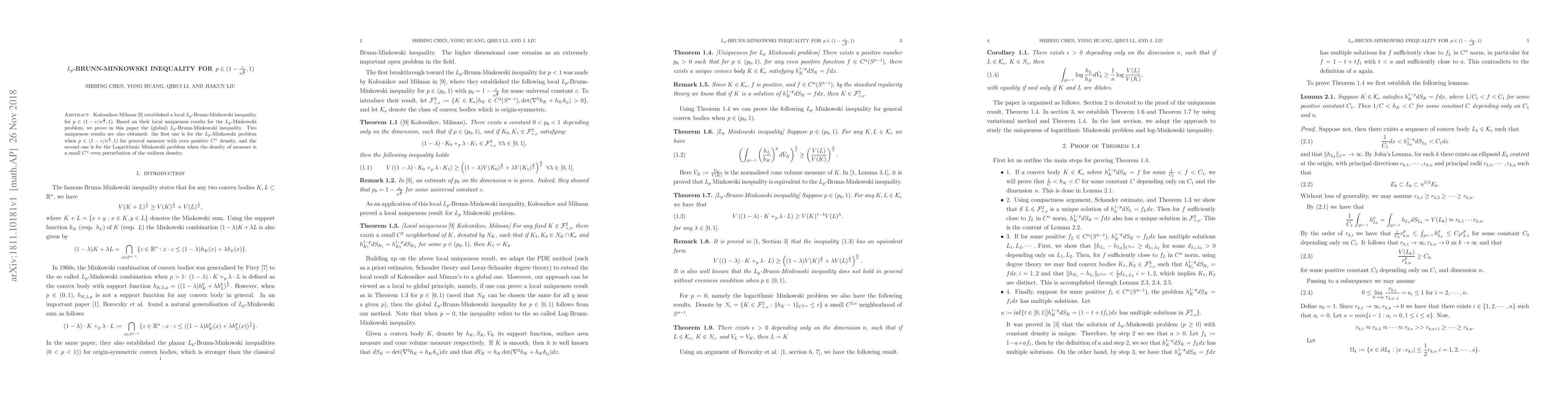 Researchers prove a global $L_p$-Brunn-Minkowski inequality for certain values of p, extending earlier local results and providing new uniqueness results for the Lp-Minkowski problem and Logarithmic Minkowski problem.