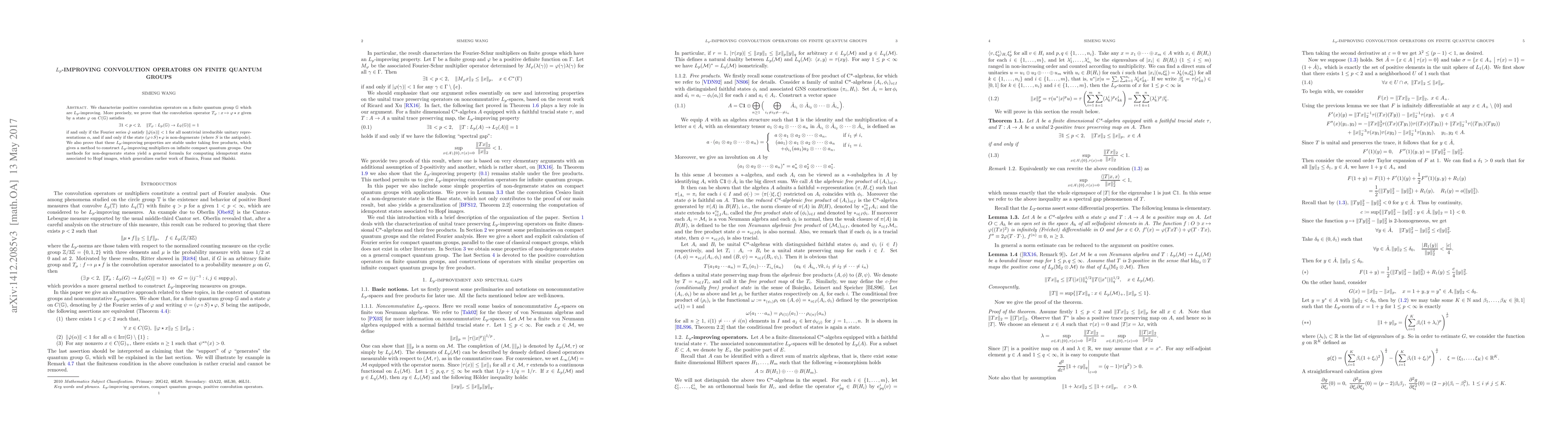 This research paper characterizes conditions for positive convolution operators on finite quantum groups to be $L_{p}$-improving, providing a method to construct such operators on infinite compact quantum groups.