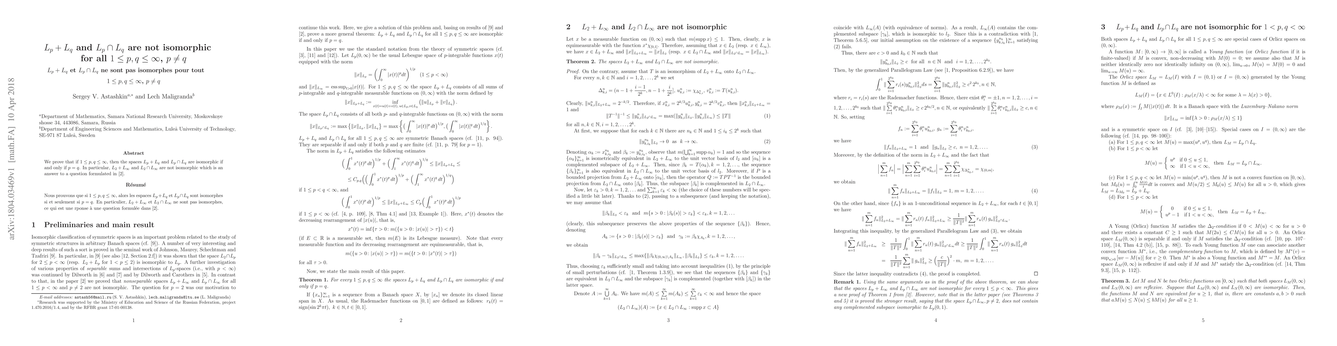 This paper proves that for $1 \leq p, q \leq \infty$, the $L_p + L_q$ and $L_p \cap L_q$ spaces are isomorphic if and only if $p = q$, thereby showing that $L_2 + L_{\infty}$ and $L_2 \cap L_{\infty}$ are not isomorphic.