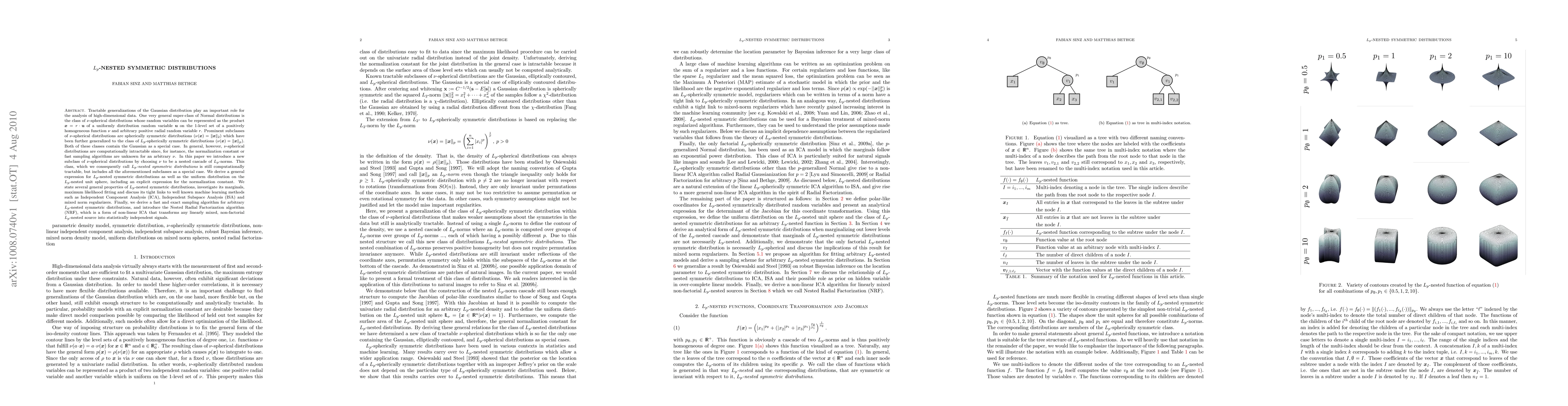 Tractable generalizations of the Gaussian distribution play an important role for the analysis of high-dimensional data. One very general super-class of Normal distributions is the class of $\nu$-spherical distributions whose random variables can be represented as the product $\x = r\cdot \u$ of a uniformly distribution random variable $\u$ on the $1$-level set of a positively homogeneous function $\nu$ and arbitrary positive radial random variable $r$. Prominent subclasses of $\nu$-spherical distributions are spherically symmetric distributions ($\nu(\x)=\|\x\|_2$) which have been further generalized to the class of $L_p$-spherically symmetric distributions ($\nu(\x)=\|\x\|_p$). Both of these classes contain the Gaussian as a special case. In general, however, $\nu$-spherical distributions are computationally intractable since, for instance, the normalization constant or fast sampling algorithms are unknown for an arbitrary $\nu$. In this paper we introduce a new subclass of $\nu$-spherical distributions by choosing $\nu$ to be a nested cascade of $L_p$-norms. This class is still computationally tractable, but includes all the aforementioned subclasses as a special case. We derive a general expression for $L_p$-nested symmetric distributions as well as the uniform distribution on the $L_p$-nested unit sphere, including an explicit expression for the normalization constant. We state several general properties of $L_p$-nested symmetric distributions, investigate its marginals, maximum likelihood fitting and discuss its tight links to well known machine learning methods such as Independent Component Analysis (ICA), Independent Subspace Analysis (ISA) and mixed norm regularizers. Finally, we derive a fast and exact sampling algorithm for arbitrary $L_p$-nested symmetric distributions, and introduce the Nested Radial Factorization algorithm (NRF), which is a form of non-linear ICA.