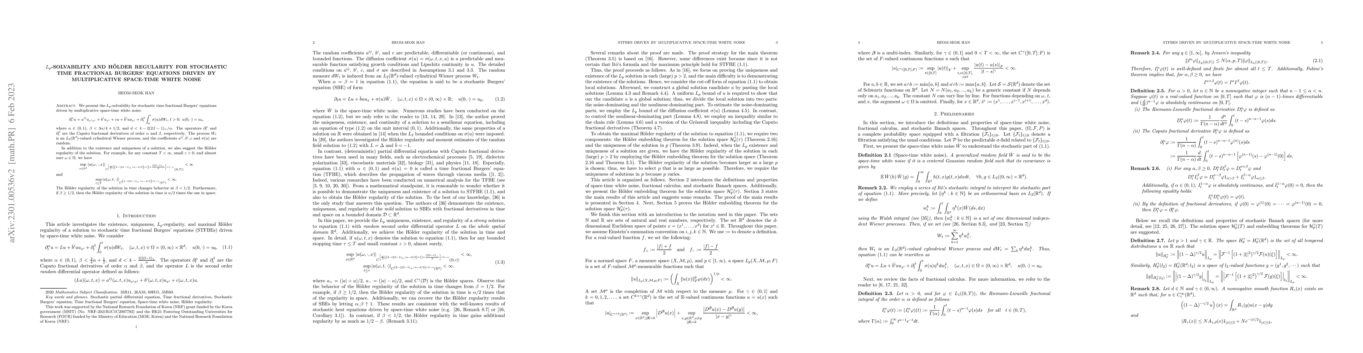 We present the $L_p$-solvability for stochastic time fractional Burgers' equations driven by multiplicative space-time white noise: $$ \partial_t^\alpha u = a^{ij}u_{x^ix^j} + b^{i}u_{x^i} + cu + \bar b^i u u_{x^i} + \partial_t^\beta\int_0^t \sigma(u)dW_t,\,t>0;\,\,u(0,\cdot) = u_0, $$ where $\alpha\in(0,1)$, $\beta < 3\alpha/4+1/2$, and $d< 4 - 2(2\beta-1)_+/\alpha$. The operators $\partial_t^\alpha$ and $\partial_t^\beta$ are the Caputo fractional derivatives of order $\alpha$ and $\beta$, respectively. The process $W_t$ is an $L_2(\mathbb{R}^d)$-valued cylindrical Wiener process, and the coefficients $a^{ij}, b^i, c$ and $\sigma(u)$ are random. In addition to the existence and uniqueness of a solution, we also suggest the H\"older regularity of the solution. For example, for any constant $T<\infty$, small $\varepsilon>0$, and almost sure $\omega\in\Omega$, we have $$ \sup_{x\in\mathbb{R}^d}|u(\omega,\cdot,x)|_{C^{[ \frac{\alpha}{2}( ( 2-(2\beta-1)_+/\alpha-d/2 )\wedge1 )+\frac{(2\beta-1)_{-}}{2} ]\wedge 1-\varepsilon}([0,T])}<\infty \quad\text{and}\quad \sup_{t\leq T}|u(\omega,t,\cdot)|_{C^{( 2-(2\beta-1)_+/\alpha-d/2 )\wedge1 - \varepsilon}(\mathbb{R}^d)} < \infty. $$ The H\"older regularity of the solution in time changes behavior at $\beta = 1/2$. Furthermore, if $\beta\geq1/2$, then the H\"older regularity of the solution in time is $\alpha/2$ times the one in space.
