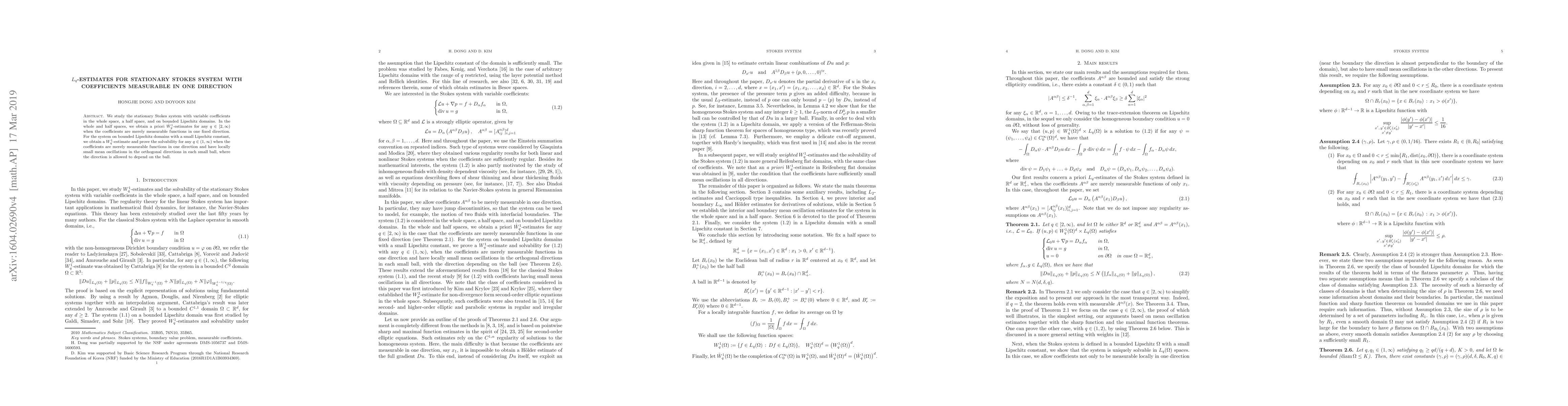 We study the stationary Stokes system with variable coefficients in the whole space, a half space, and on bounded Lipschitz domains. In the whole and half spaces, we obtain a priori $\dot W^1_q$-estimates for any $q\in [2,\infty)$ when the coefficients are merely measurable functions in one fixed direction. For the system on bounded Lipschitz domains with a small Lipschitz constant, we obtain a $W^1_q$-estimate and prove the solvability for any $q\in (1,\infty)$ when the coefficients are merely measurable functions in one direction and have locally small mean oscillations in the orthogonal directions in each small ball, where the direction is allowed to depend on the ball.