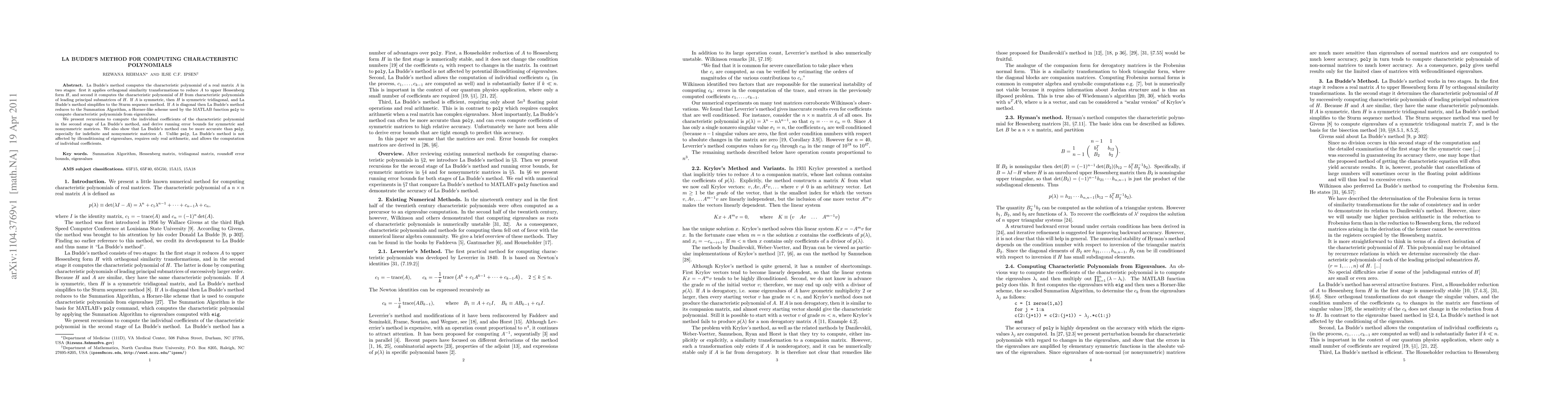 La Budde's method improves on existing algorithms for computing characteristic polynomials of real matrices by providing accurate and efficient recursive formulas with no illconditioning issues or reliance on complex arithmetic.