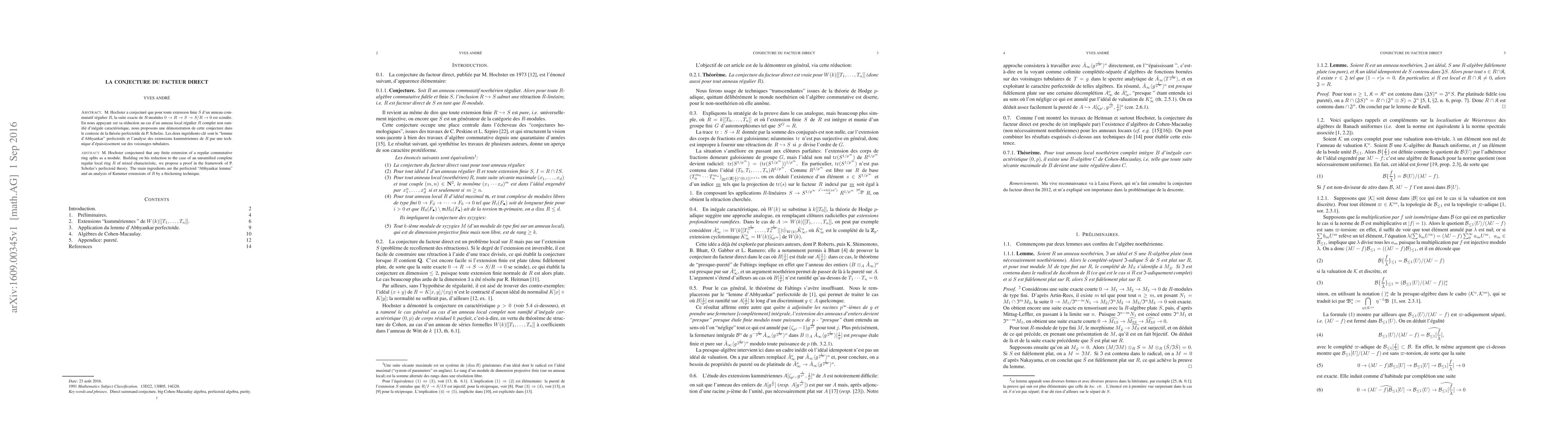 Building on his reduction to the case of an unramified complete regular local ring R of mixed characteristic, we propose a proof in the framework of P. Scholze's perfectoid theory. The main ingredients are the perfectoid "Abhyankar lemma" and an analysis of Kummer extensions of R by a thickening technique.