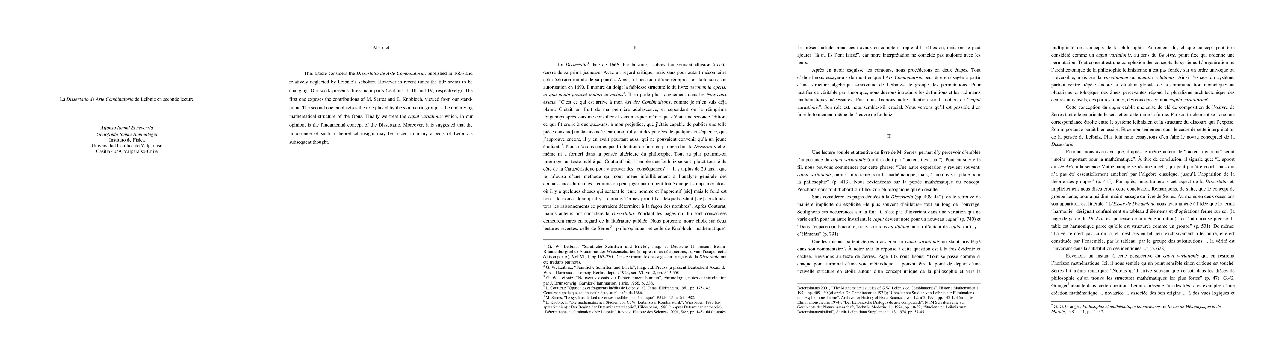 This paper examines Leibniz's Dissertatio de Arte Combinatoria, highlighting contributions from M. Serres and E. Knobloch, the role of the symmetric group, and the fundamental concept of caput variationis, suggesting its significance in Leibniz's later work.
