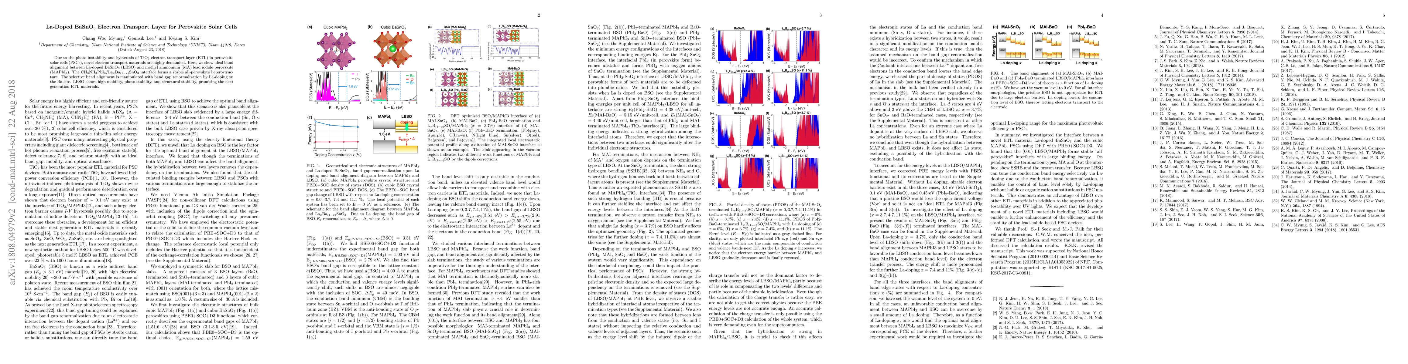 This paper investigates La-doped BaSnO$_3$ (LBSO) as an electron transport layer (ETL) for perovskite solar cells, demonstrating its ideal band alignment with MAPbI$_3$ and superior photo-stability, high mobility, and structural stability compared to traditional TiO$_2$ ETLs. LBSO's band gap renormalization through La-doping enhances its potential as a next-generation ETL material.