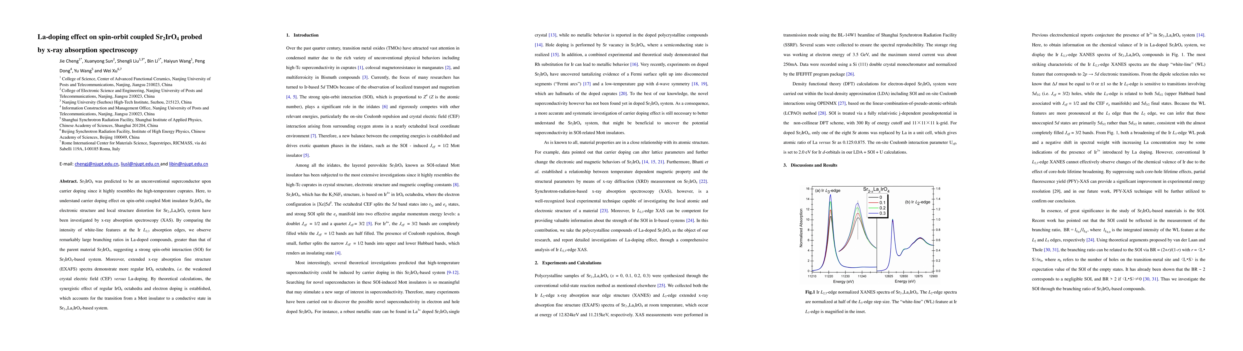 This paper investigates the La-doping effect on spin-orbit coupled Sr2IrO4 using x-ray absorption spectroscopy, revealing enhanced spin-orbit interaction and regular IrO6 octahedra. Theoretical calculations support the transition from a Mott insulator to a conductive state due to electron doping and structural changes.