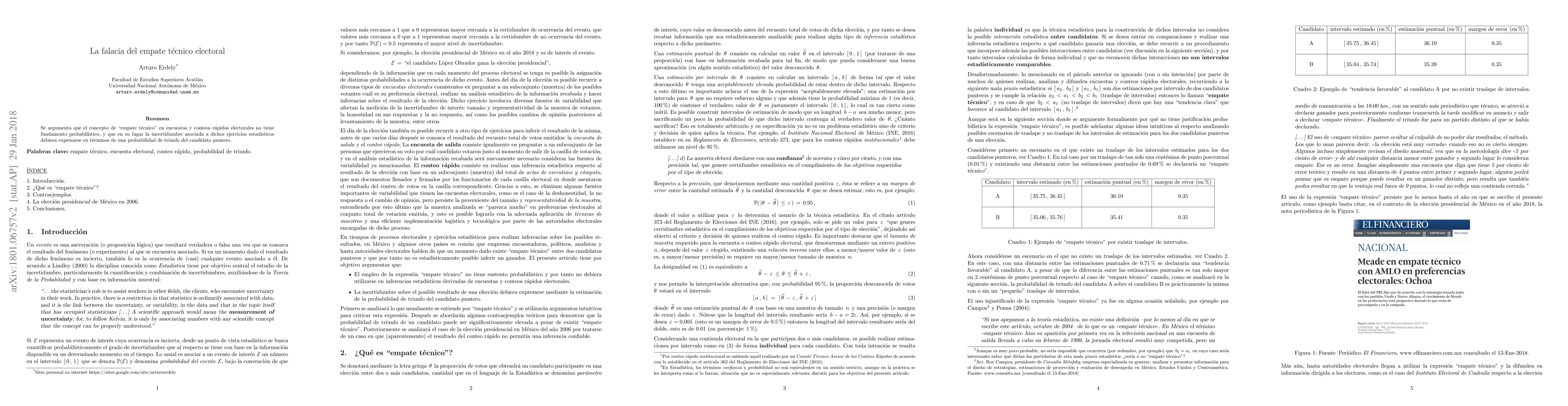 Summary: The paper argues that the concept of "technical tie" in electoral polls lacks a probabilistic basis and should instead express uncertainty in terms of the probability of victory for the leading candidate. It critiques the use of "technical tie" in quick counts and electoral statistics.