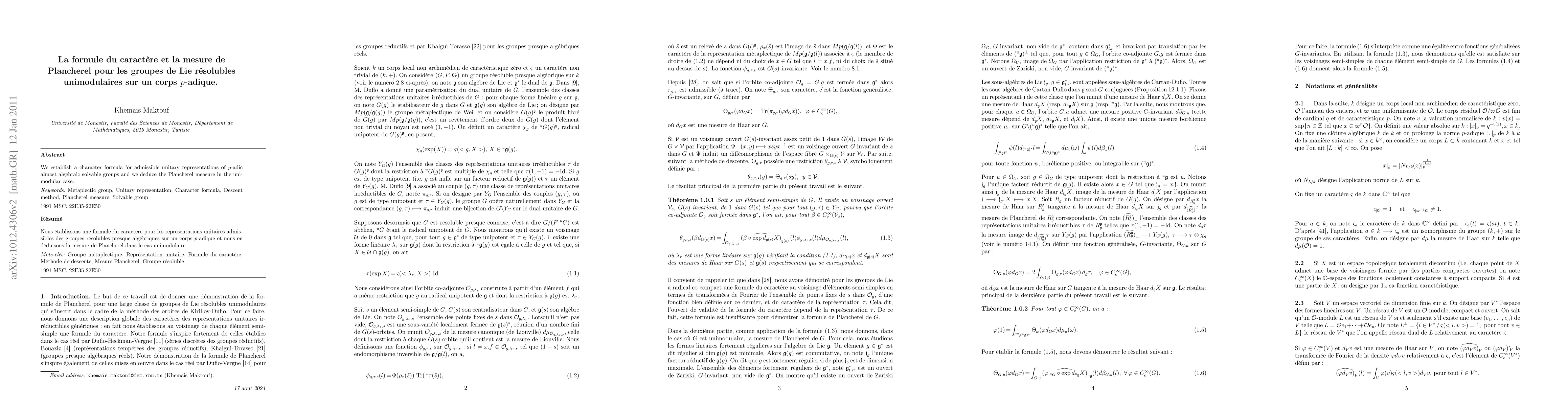 We establish a character formula for admissible unitary representations of $p$-adic almost algebraic solvable groups and we deduce the Plancherel measure in the unimodular case.