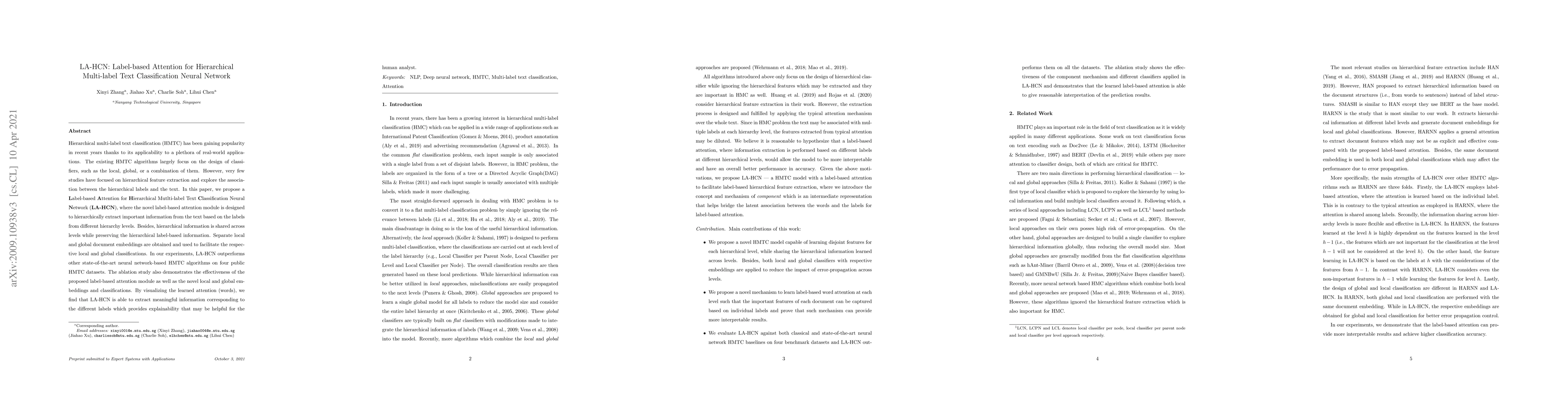 This paper proposes LA-HCN, a neural network for hierarchical multi-label text classification that employs a label-based attention module to extract text information relevant to different label hierarchies, improving both local and global classification performance. Experimental results show superior performance over other algorithms and provide insights into the model's interpretability.