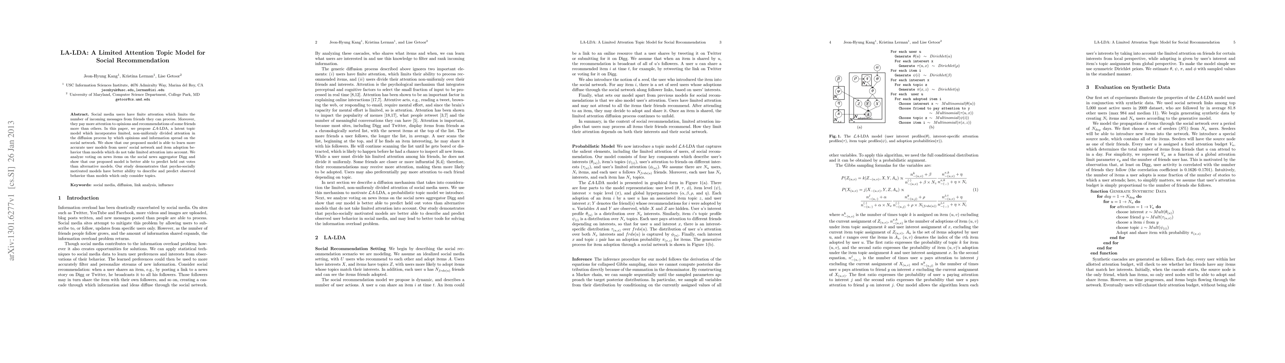 Title: LA-LDA: A Limited Attention Topic Model for Social Recommendation Summary: This paper introduces LA-LDA, a latent topic model that accounts for users' limited attention in social networks, showing improved accuracy in predicting user behavior compared to traditional models. The model's effectiveness is demonstrated through its superior performance in predicting news item votes on Digg.