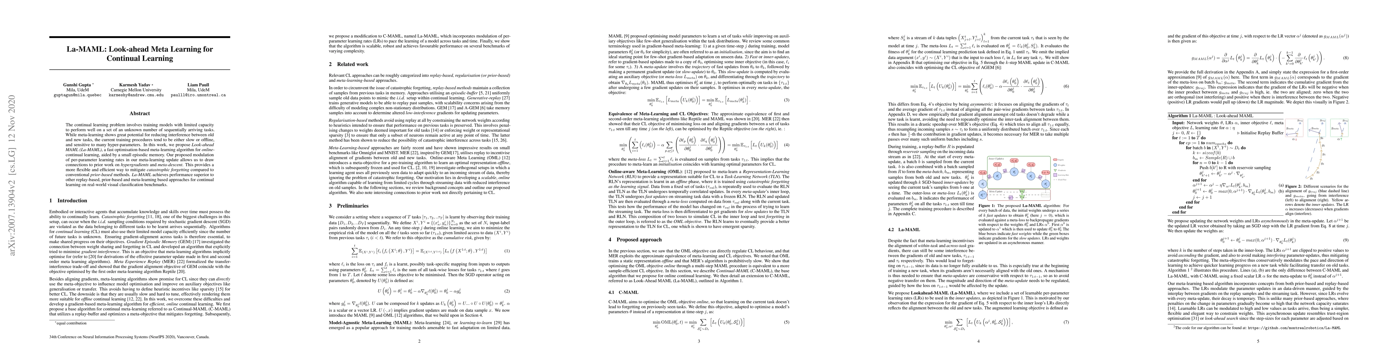 The continual learning problem involves training models with limited capacity to perform well on a set of an unknown number of sequentially arriving tasks. While meta-learning shows great potential for reducing interference between old and new tasks, the current training procedures tend to be either slow or offline, and sensitive to many hyper-parameters. In this work, we propose Look-ahead MAML (La-MAML), a fast optimisation-based meta-learning algorithm for online-continual learning, aided by a small episodic memory. Our proposed modulation of per-parameter learning rates in our meta-learning update allows us to draw connections to prior work on hypergradients and meta-descent. This provides a more flexible and efficient way to mitigate catastrophic forgetting compared to conventional prior-based methods. La-MAML achieves performance superior to other replay-based, prior-based and meta-learning based approaches for continual learning on real-world visual classification benchmarks. Source code can be found here: https://github.com/montrealrobotics/La-MAML