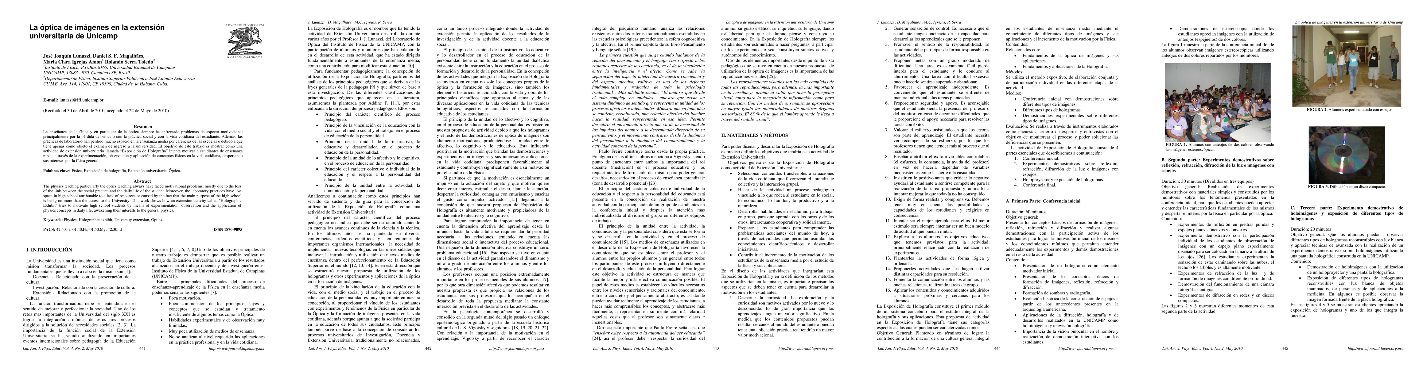 The physics teaching particularly the optics teaching always have faced motivational problems, mostly due to the loss of the link between the social practice and the daily life of the student. Moreover, the laboratory practices have lost space in high school attributable to a lack of resources or caused by the fact that the main purpose of the high school is being no more than the access to the University. This work shows how an extension activity called "Holographic Exhibit" tries to motivate high school students by means of experimentation, observation and the application of physics concepts in daily life, awakening their interests to the general physics. La ensenanza de la fisica y en particular de la optica siempre ha enfrentado problemas de aspecto motivacional principalmente por la perdida del vinculo con la practica social y con la vida cotidiana del estudiante. Ademas, las practicas de laboratorio han perdido mucho espacio en la ensenanza media por carencias de las escuelas o debido a que tiene apenas como objeto el examen de ingreso a la universidad. El objetivo de este trabajo es mostrar como una actividad de extensi\'on universitaria llamada 'Exposicion de Holografia' intenta motivar a estudiantes de ense\~nanza media a traves de la experimentacion, observacion y aplicacion de conceptos fisicos en la vida cotidiana, despertando sus intereses por la f\'isica general.