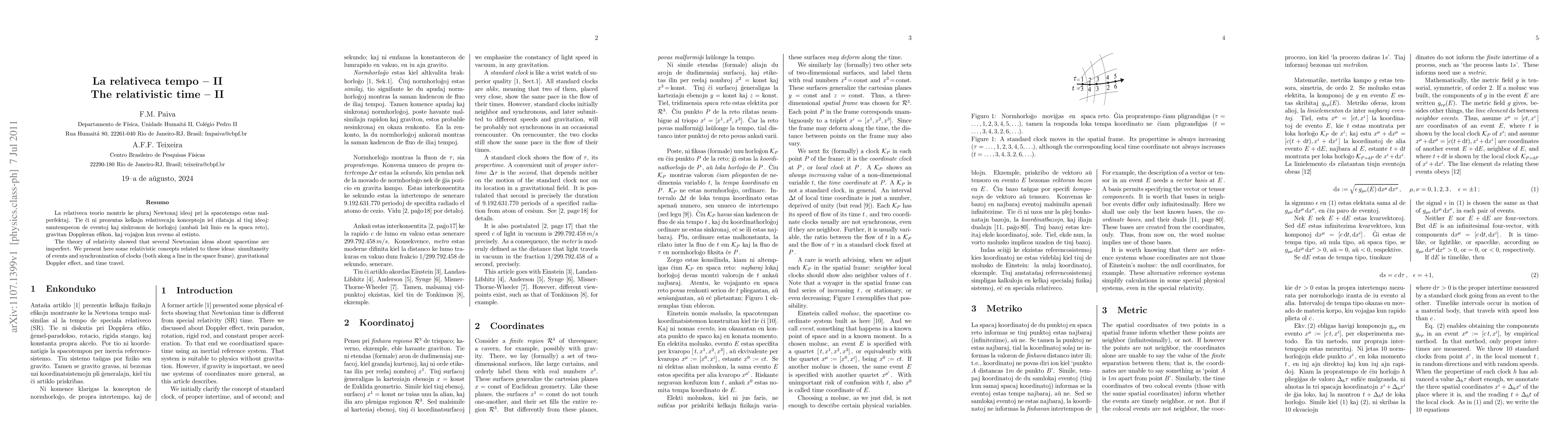 The theory of relativity showed that several Newtonian ideas about spacetime are imperfect. We present here some relativistic concepts related to these ideas: simultaneity of events and synchronization of clocks (both along a line in the space frame), gravitational Doppler effect, and time travel. --------- La relativeca teorio montris ke pluraj Newtonaj ideoj pri la spacotempo estas malperfektaj. Tie cxi ni prezentas kelkajn relativecajn konceptojn iel rilatajn al tiuj ideoj: samtempecon de eventoj kaj sinkronon de horlogxoj (ambaux laux linio en la spaca reto), gravitan Doppleran efikon, kaj vojagxon kun reveno al estinto.