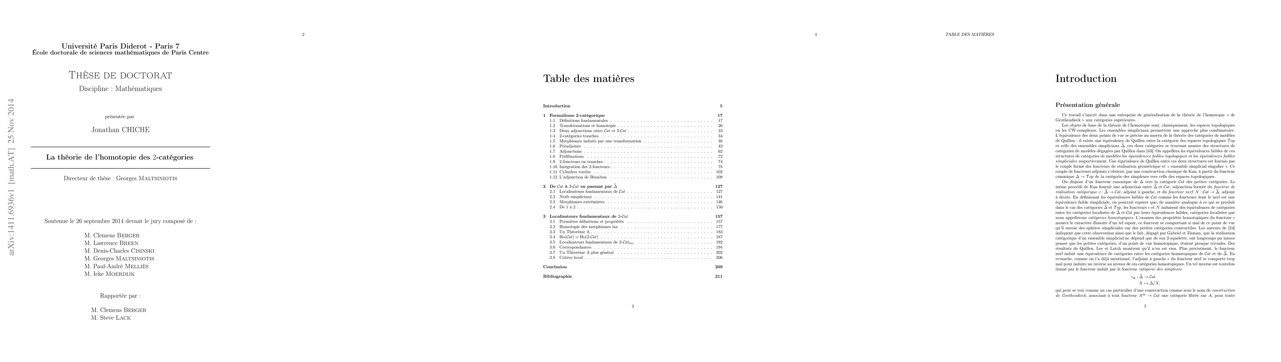 On d\'eveloppe une th\'eorie de l'homotopie des 2-cat\'egories analogue \`a la th\'eorie de l'homotopie des cat\'egories d\'evelopp\'ee par Grothendieck dans "\`A la poursuite des champs". Il s'agit de la th\`ese de doctorat de l'auteur. We develop a homotopy theory of 2-categories analogous to Grothendieck's homotopy theory of categories developed in "Pursuing Stacks." This is the author's PhD thesis.