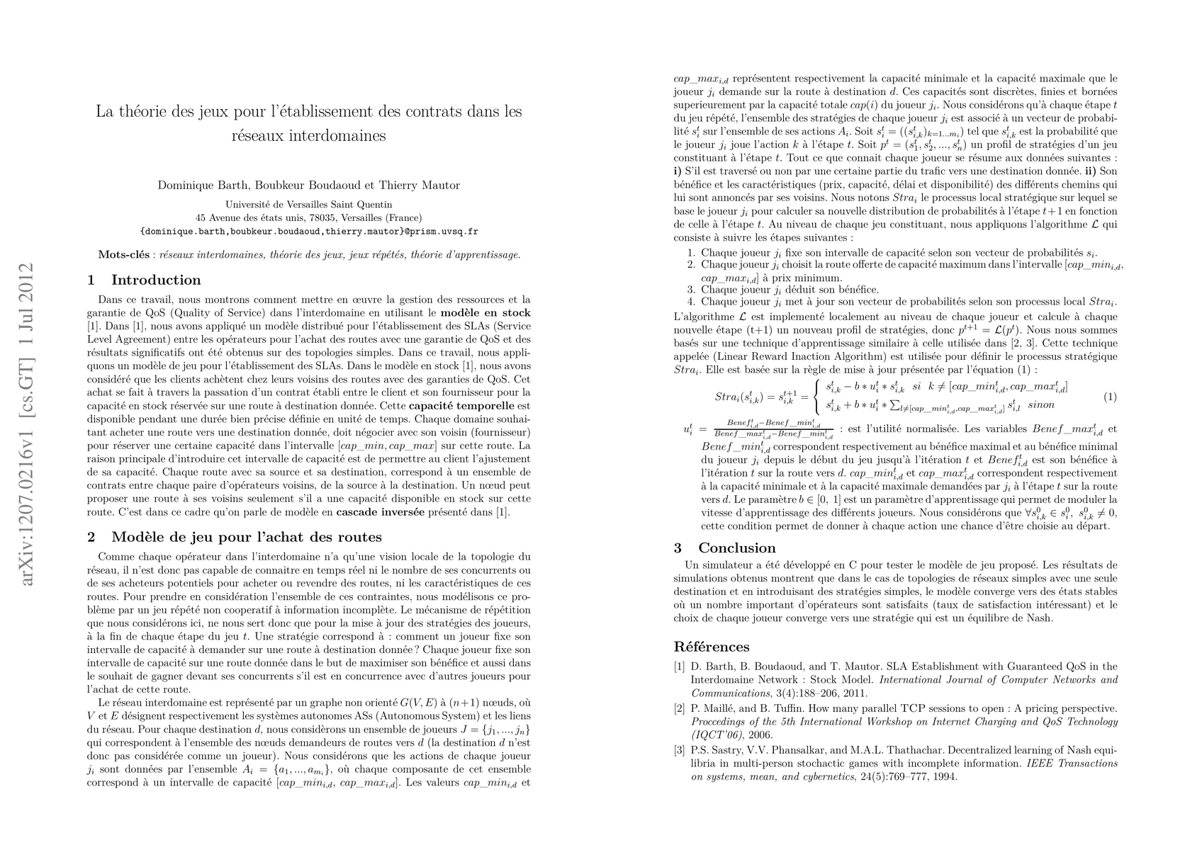 Summary: Cet article propose l'utilisation de la théorie des jeux pour établir des contrats de Service Level Agreement (SLA) entre les opérateurs dans les réseaux interdomaines, garantissant ainsi la qualité de service (QoS) et la gestion des ressources. Les résultats obtenus sur des topologies simples montrent des succès significatifs.