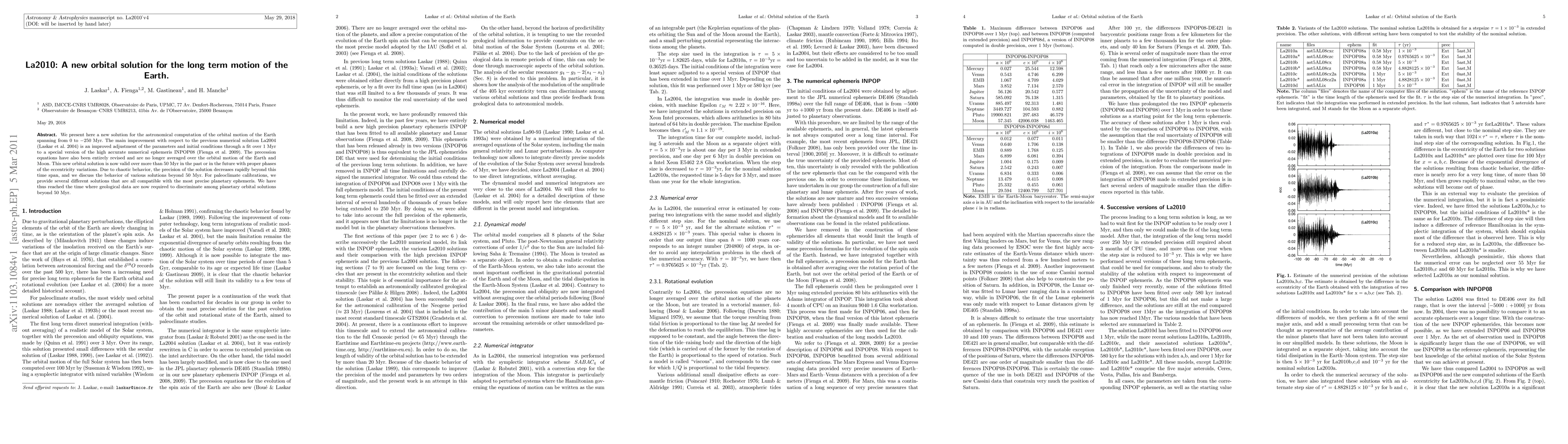 We present here a new solution for the astronomical computation of the orbital motion of the Earth spanning from 0 to -250 Myr. The main improvement with respect to the previous numerical solution La2004 (Laskar et al. 2004) is an improved adjustment of the parameters and initial conditions through a fit over 1 Myr to a special version of the high accurate numerical ephemeris INPOP08 (Fienga et al. 2009). The precession equations have also been entirely revised and are no longer averaged over the orbital motion of the Earth and Moon. This new orbital solution is now valid over more than 50 Myr in the past or in the future with proper phases of the eccentricity variations. Due to chaotic behavior, the precision of the solution decreases rapidly beyond this time span, and we discuss the behavior of various solutions beyond 50 Myr. For paleoclimate calibrations, we provide several different solutions that are all compatible with the most precise planetary ephemeris. We have thus reached the time where geological data are now required to discriminate among planetary orbital solutions beyond 50 Myr.