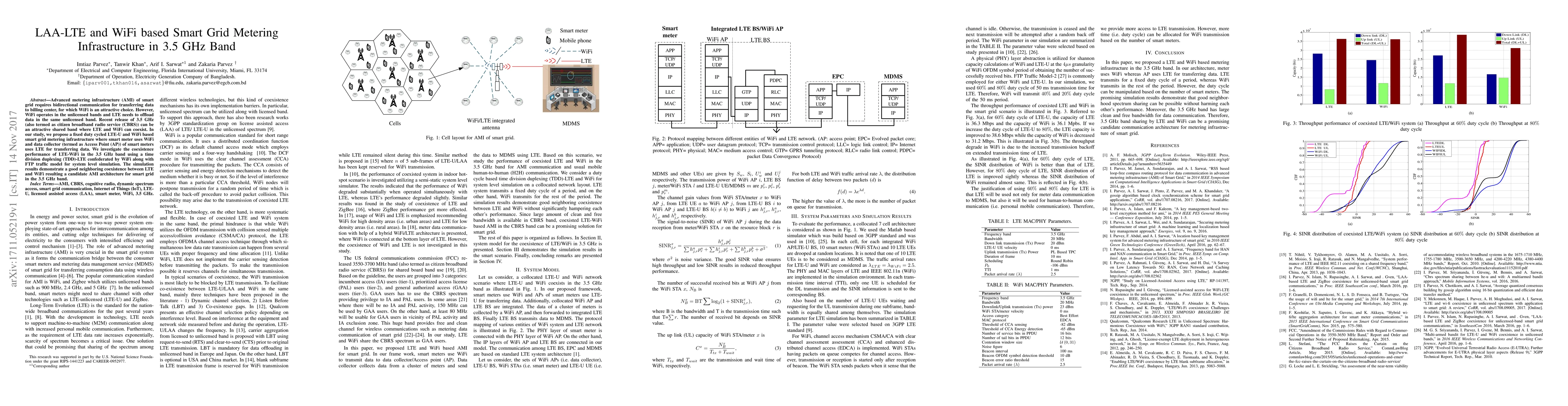 This paper proposes a smart grid metering infrastructure utilizing both LTE and WiFi in the 3.5 GHz band, termed citizen broadband radio service (CBRS). The study investigates the coexistence performance of LTE-WiFi using a time division duplexing (TDD) LTE confederated by WiFi, demonstrating effective data transfer and promising candidate architecture for advanced metering infrastructure (AMI).
