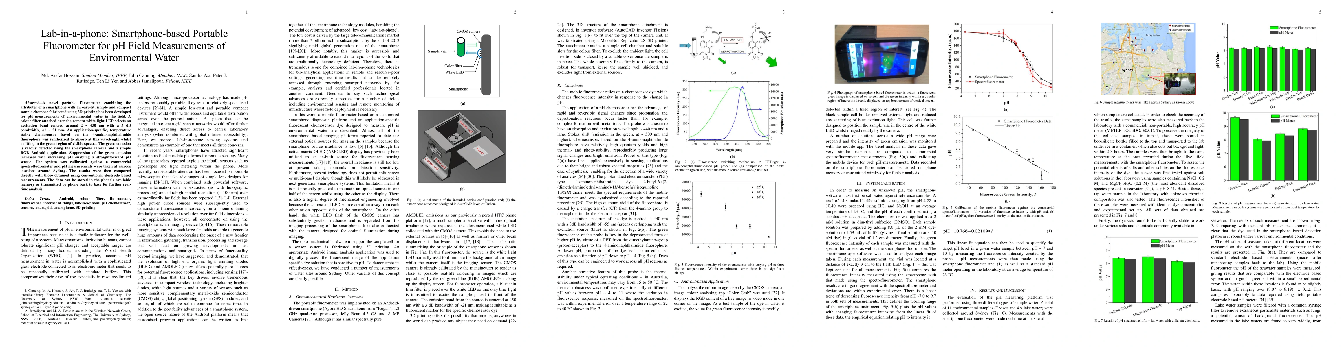 Summary: A new portable fluorometer integrates smartphone technology with a compact, 3D-printed sample chamber for field pH measurements in environmental water. Its accuracy was validated against conventional electrode-based measurements.