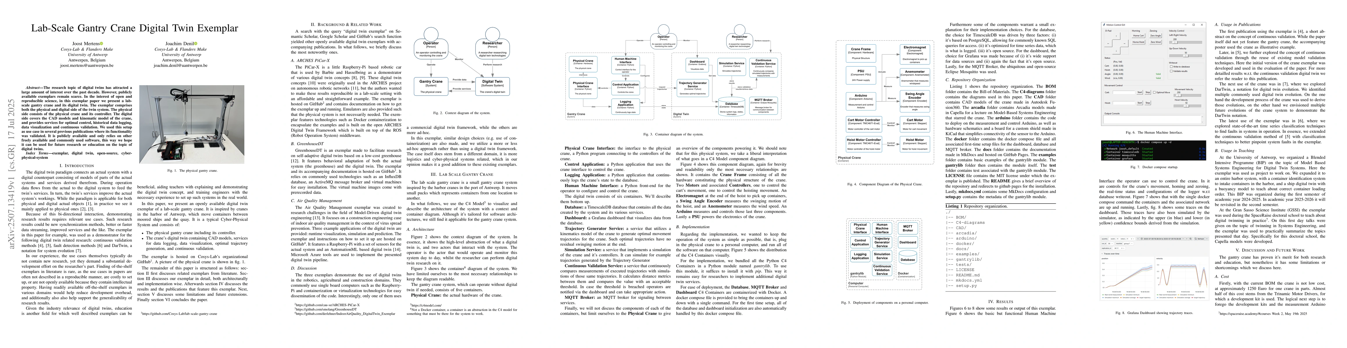 The research presents a lab-scale gantry crane digital twin exemplar, combining physical crane hardware and a digital side with CAD models, kinematic model, and services for optimal control, data logging, visualization, and validation. It's built with freely available software and validated in previous publications.