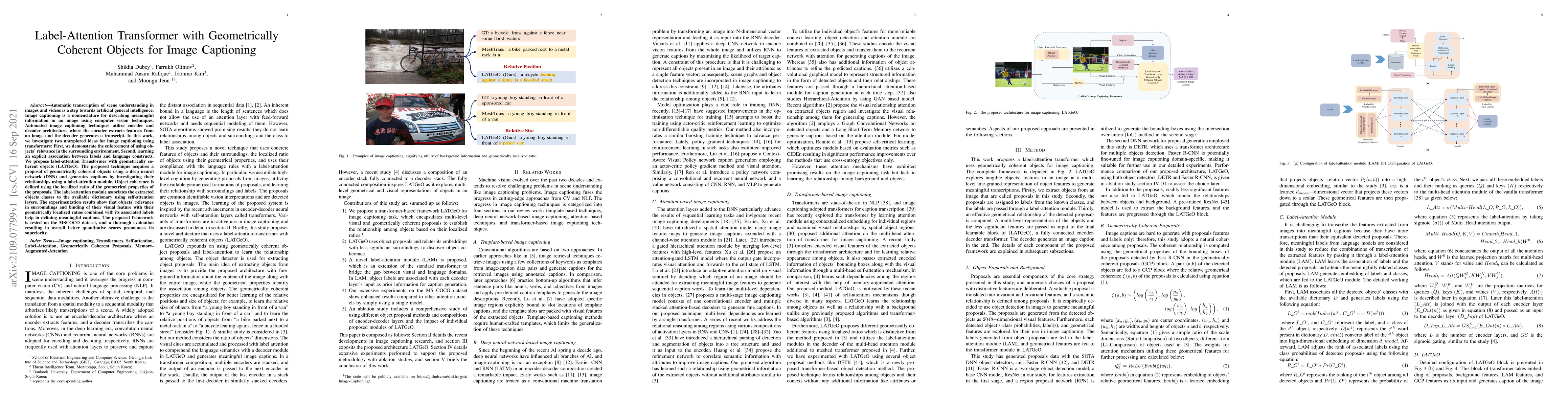 This paper proposes a Label-Attention Transformer with Geometrically Coherent Objects (LATGeO) for image captioning, which leverages object relevance and explicit label-attention to generate meaningful captions. Experiments on the MSCOCO dataset show improved performance over existing methods.