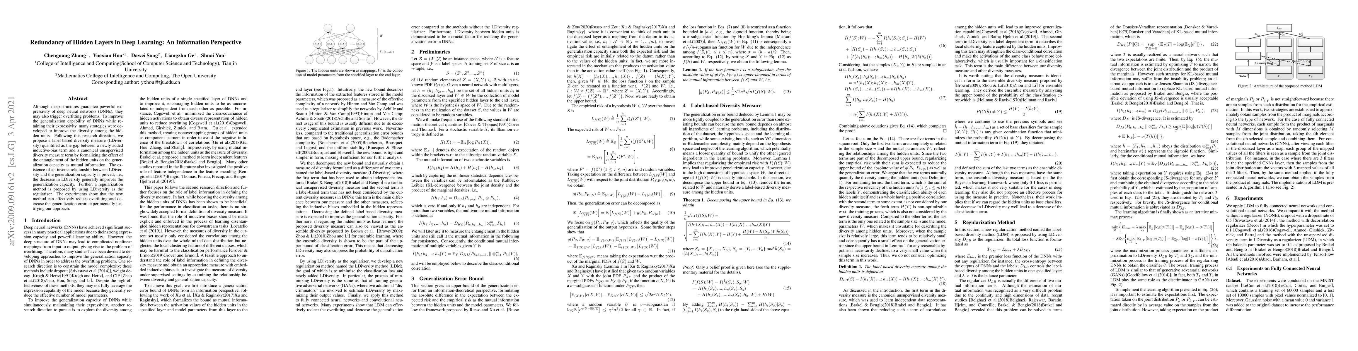 Although the deep structure guarantees the powerful expressivity of deep networks (DNNs), it also triggers serious overfitting problem. To improve the generalization capacity of DNNs, many strategies were developed to improve the diversity among hidden units. However, most of these strategies are empirical and heuristic in absence of either a theoretical derivation of the diversity measure or a clear connection from the diversity to the generalization capacity. In this paper, from an information theoretic perspective, we introduce a new definition of redundancy to describe the diversity of hidden units under supervised learning settings by formalizing the effect of hidden layers on the generalization capacity as the mutual information. We prove an opposite relationship existing between the defined redundancy and the generalization capacity, i.e., the decrease of redundancy generally improving the generalization capacity. The experiments show that the DNNs using the redundancy as the regularizer can effectively reduce the overfitting and decrease the generalization error, which well supports above points.