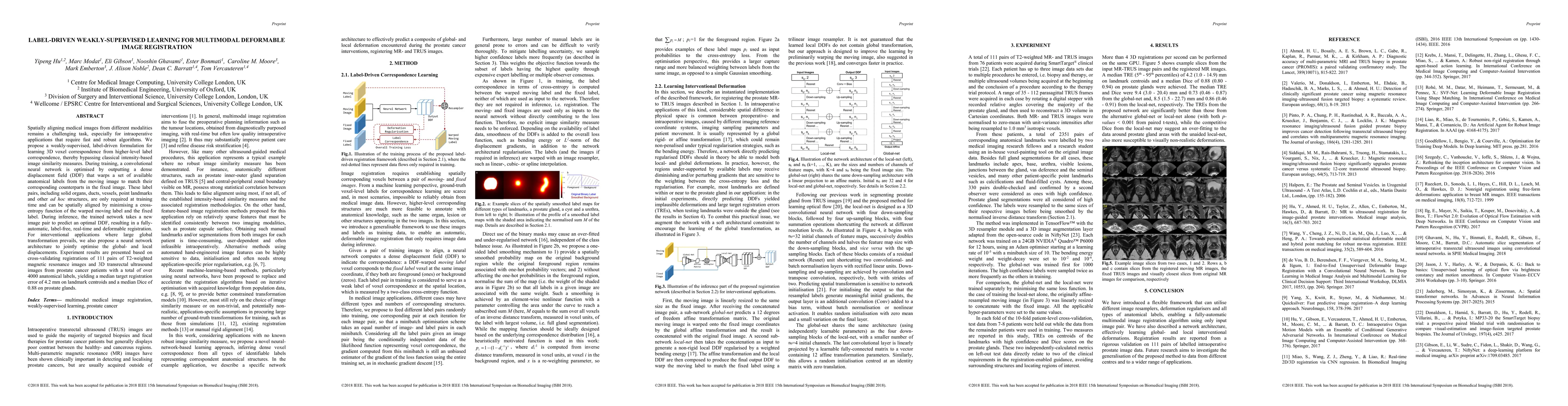 This paper proposes a weakly-supervised learning method for multimodal deformable image registration using anatomical labels to guide the alignment of medical images. The method trains a convolutional neural network to predict a dense displacement field, achieving fully automatic, real-time registration without requiring intensity-based measures.