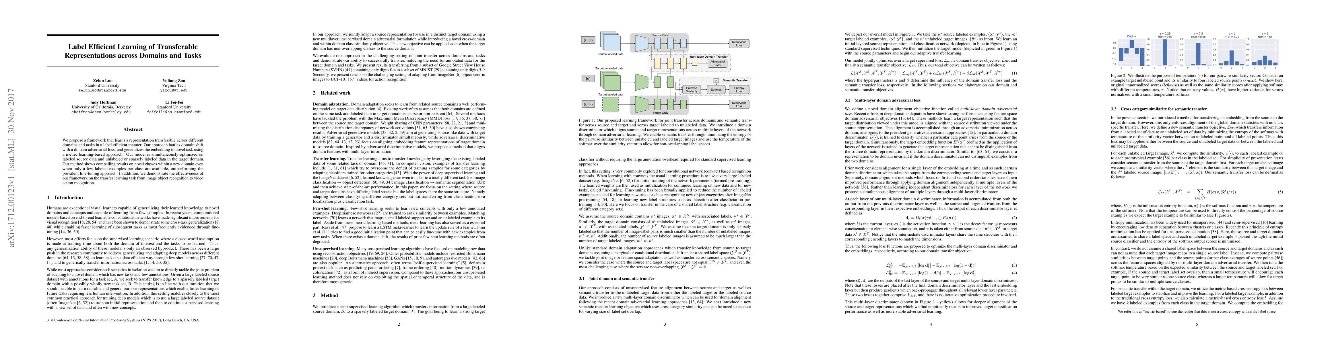 This paper introduces a label-efficient framework for learning transferable representations across domains and tasks, using domain adversarial loss to combat domain shift and metric learning to generalize embeddings. The method outperforms fine-tuning by leveraging labeled source data and unlabeled/sparsely labeled target data, demonstrating effective transfer from image object recognition to video action recognition.
