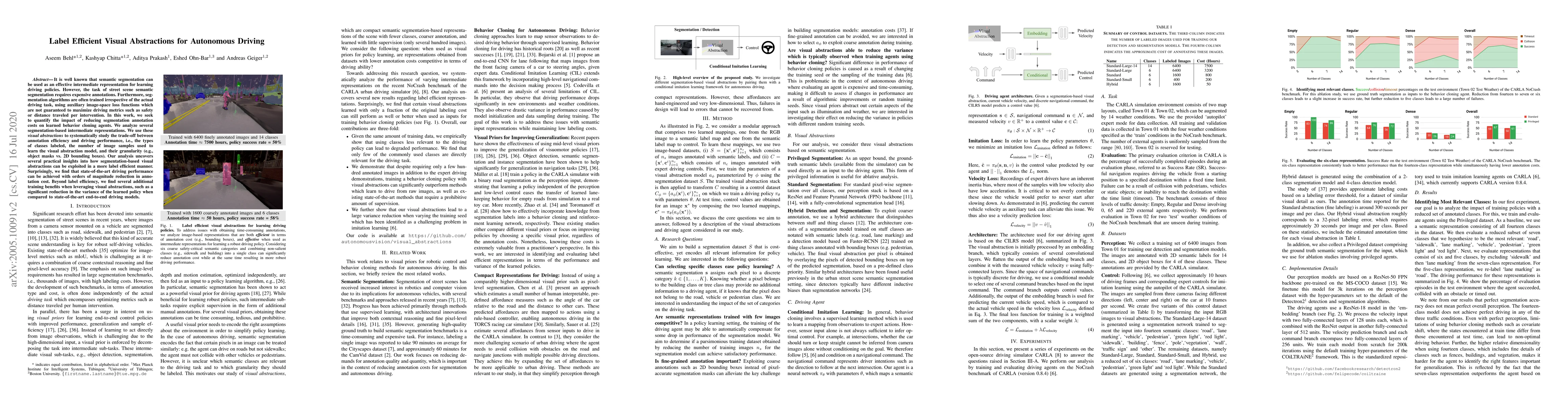 It is well known that semantic segmentation can be used as an effective intermediate representation for learning driving policies. However, the task of street scene semantic segmentation requires expensive annotations. Furthermore, segmentation algorithms are often trained irrespective of the actual driving task, using auxiliary image-space loss functions which are not guaranteed to maximize driving metrics such as safety or distance traveled per intervention. In this work, we seek to quantify the impact of reducing segmentation annotation costs on learned behavior cloning agents. We analyze several segmentation-based intermediate representations. We use these visual abstractions to systematically study the trade-off between annotation efficiency and driving performance, i.e., the types of classes labeled, the number of image samples used to learn the visual abstraction model, and their granularity (e.g., object masks vs. 2D bounding boxes). Our analysis uncovers several practical insights into how segmentation-based visual abstractions can be exploited in a more label efficient manner. Surprisingly, we find that state-of-the-art driving performance can be achieved with orders of magnitude reduction in annotation cost. Beyond label efficiency, we find several additional training benefits when leveraging visual abstractions, such as a significant reduction in the variance of the learned policy when compared to state-of-the-art end-to-end driving models.
